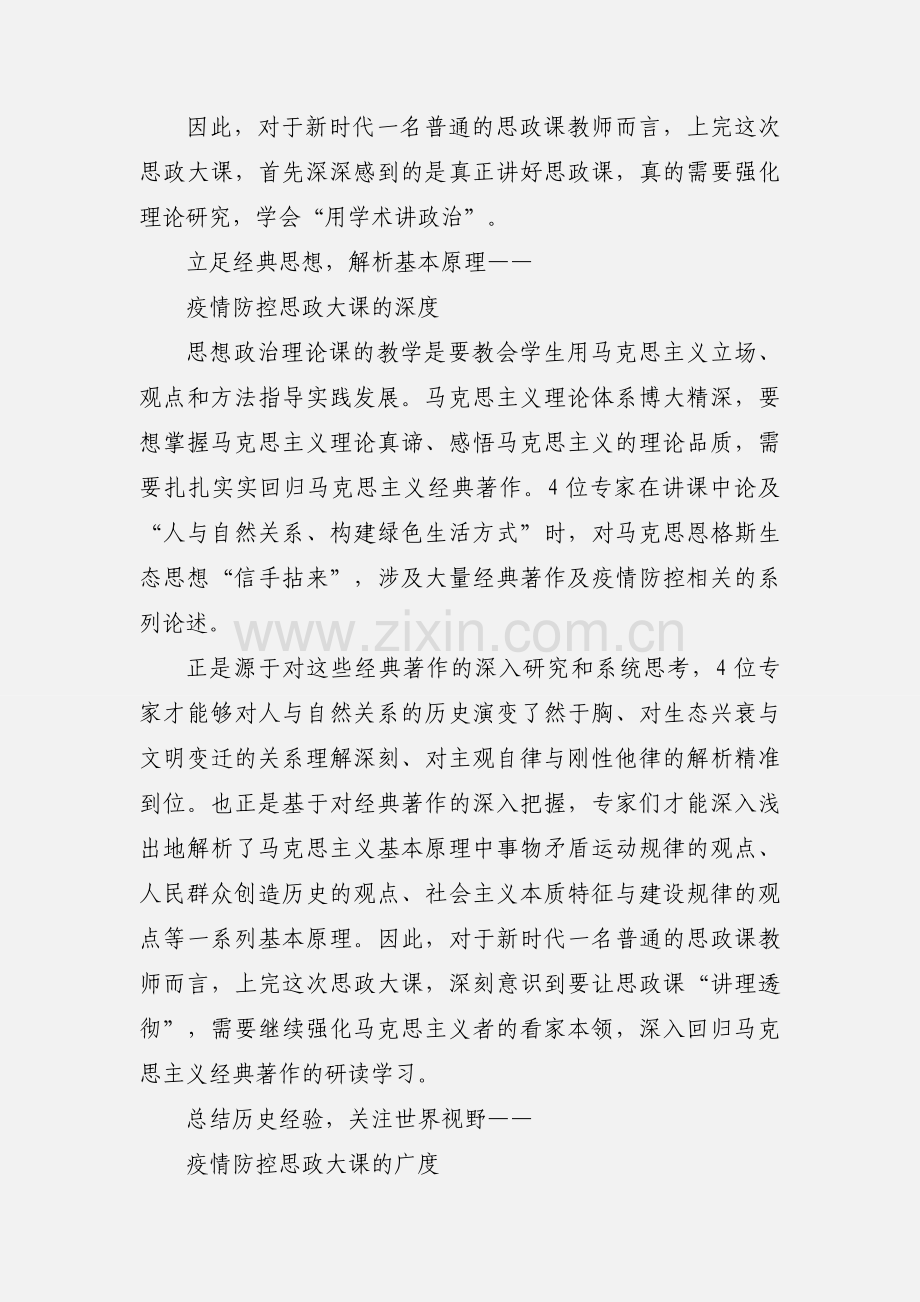 从整个思政大课来看,4位专家做了精心准备。一方面全面了解疫情防控的最新进展,另一方面对当代青年学生群体特点精准把握。一个个真实的疫情防控案例、一组组精准的疫情防控数据、一幅幅感人的疫情防控照片、一句句贴近学生实际的话语表达……这些在无形中营造了一种独特的思政大课环境,让学生有种身临其境之感,切实拉近了主讲教授与学生之间的距离。因此,对于新时代一名普通的思政课教师而言,上完这次思政大课,充分意识到要让学生“真心喜欢”思政课,就需要增加思政课的温度,真正做到理论阐释回应现实问题,思政教学贴近学生实际。