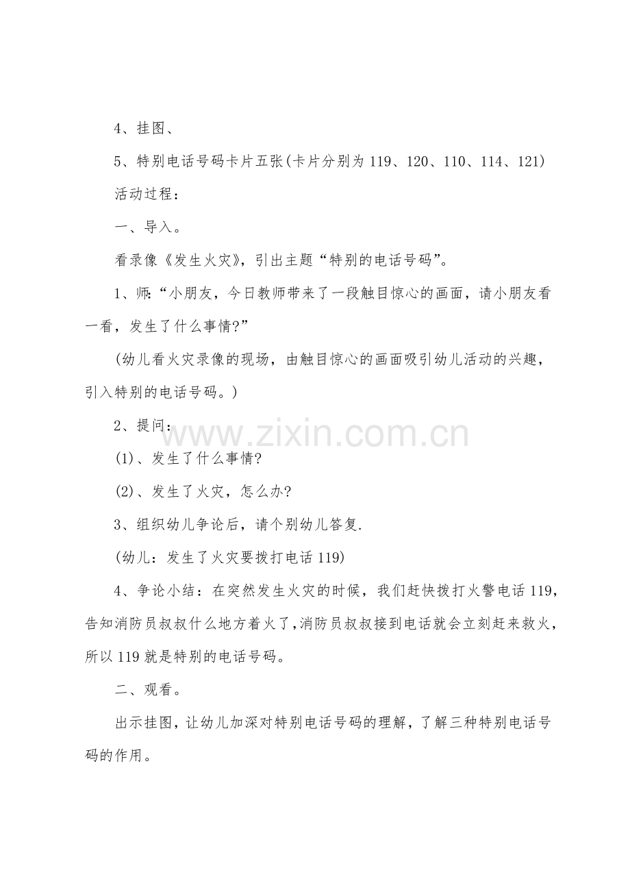 4、争论小结:在突然发生火灾的时候,我们赶快拨打火警电话119,告知消防员叔叔什么地方着火了,消防员叔叔接到电话就会立刻赶来救火,所以119就是特别的电话号码。