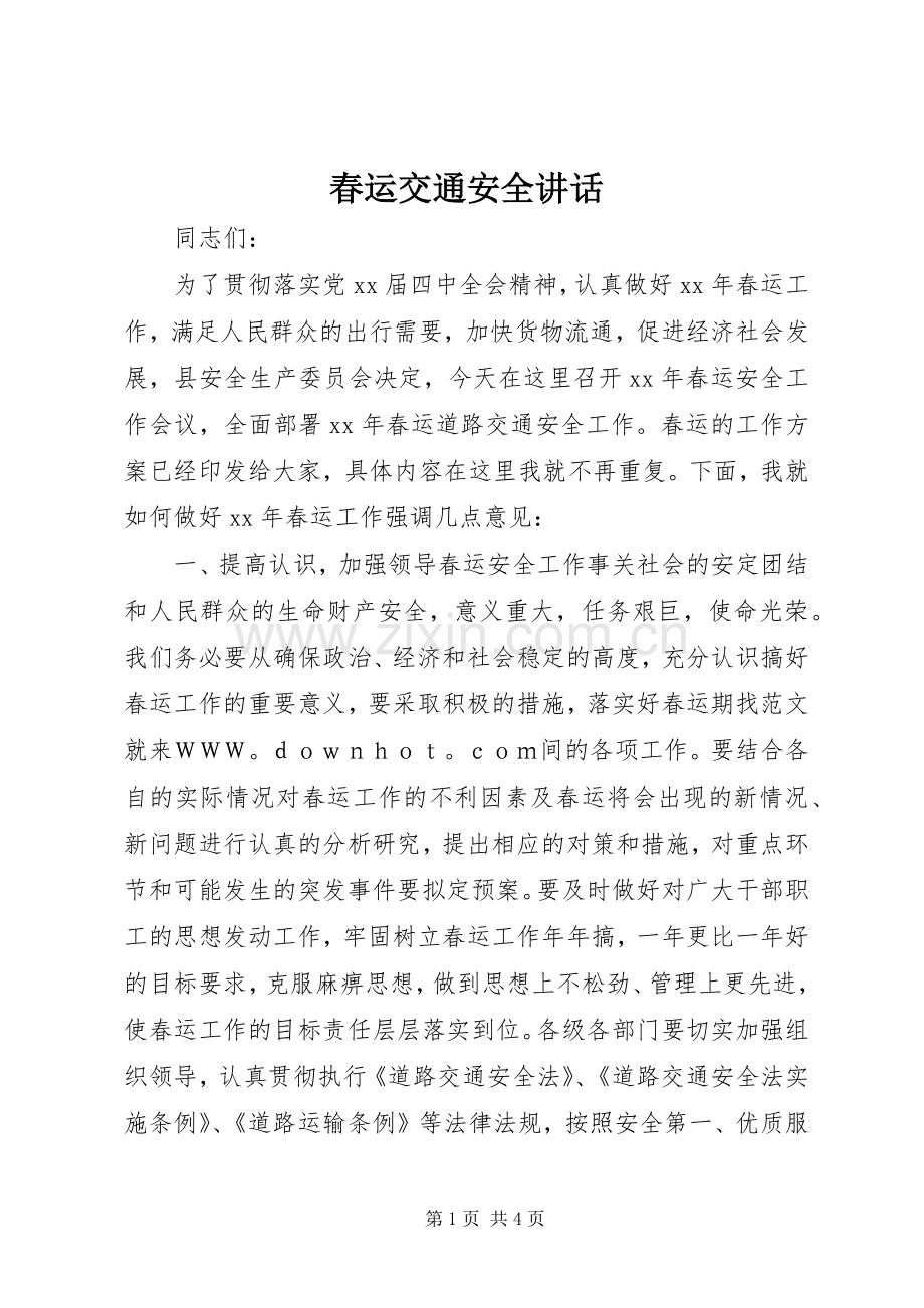 为了贯彻落实党xx届四中全会精神,认真做好xx年春运工作,满足人民群众的出行需要,加快货物流通,促进经济社会发展,县安全生产委员会决定,今天在这里召开xx年春运安全工作会议,全面部署xx年春运道路交通安全工作。春运的工作方案已经印发给大家,具体内容在这里我就不再重复。下面,我就如何做好xx年春运工作强调几点意见: