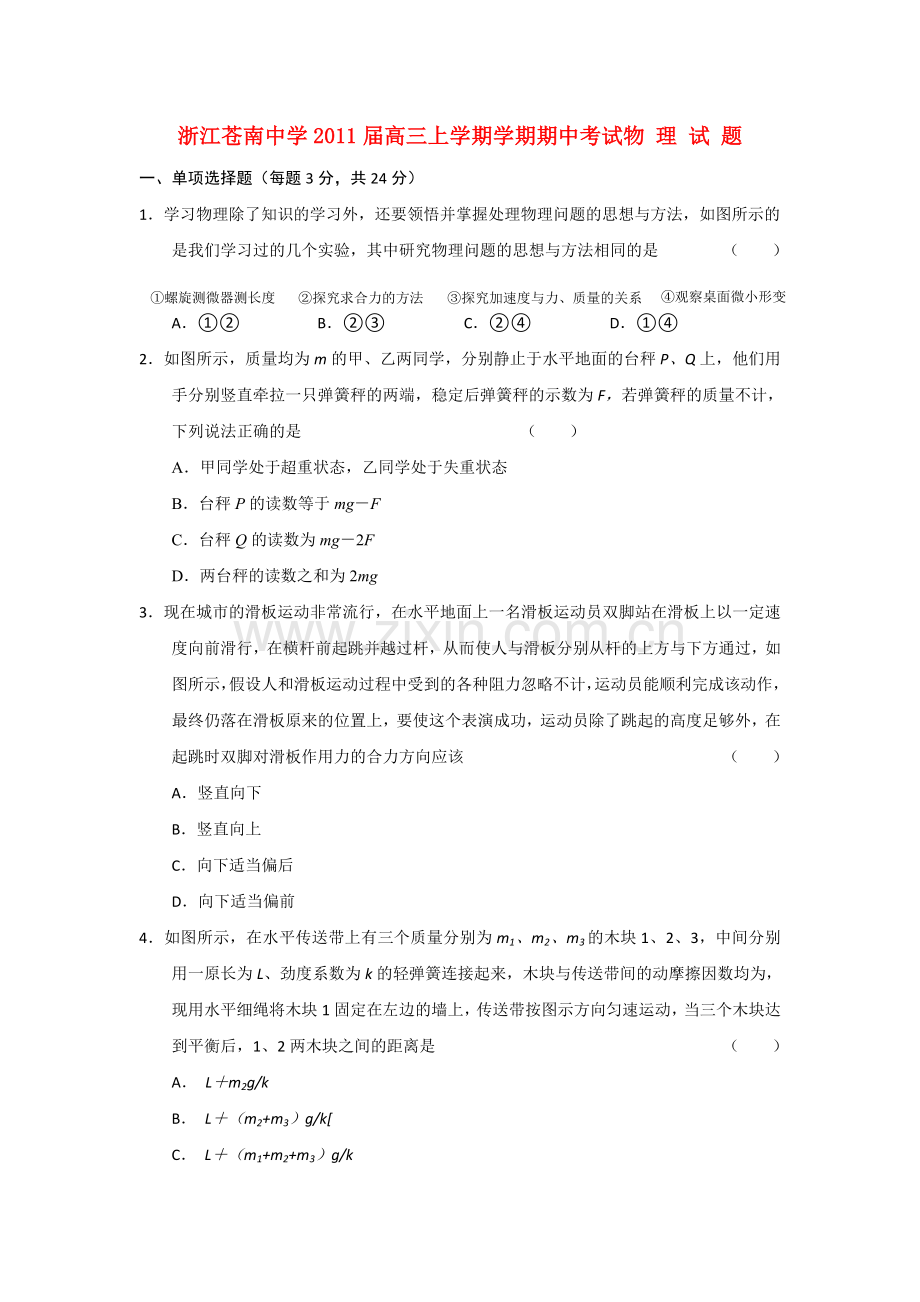 浙江苍南中学2011届高三上学期学期期中考试物 理 试 题