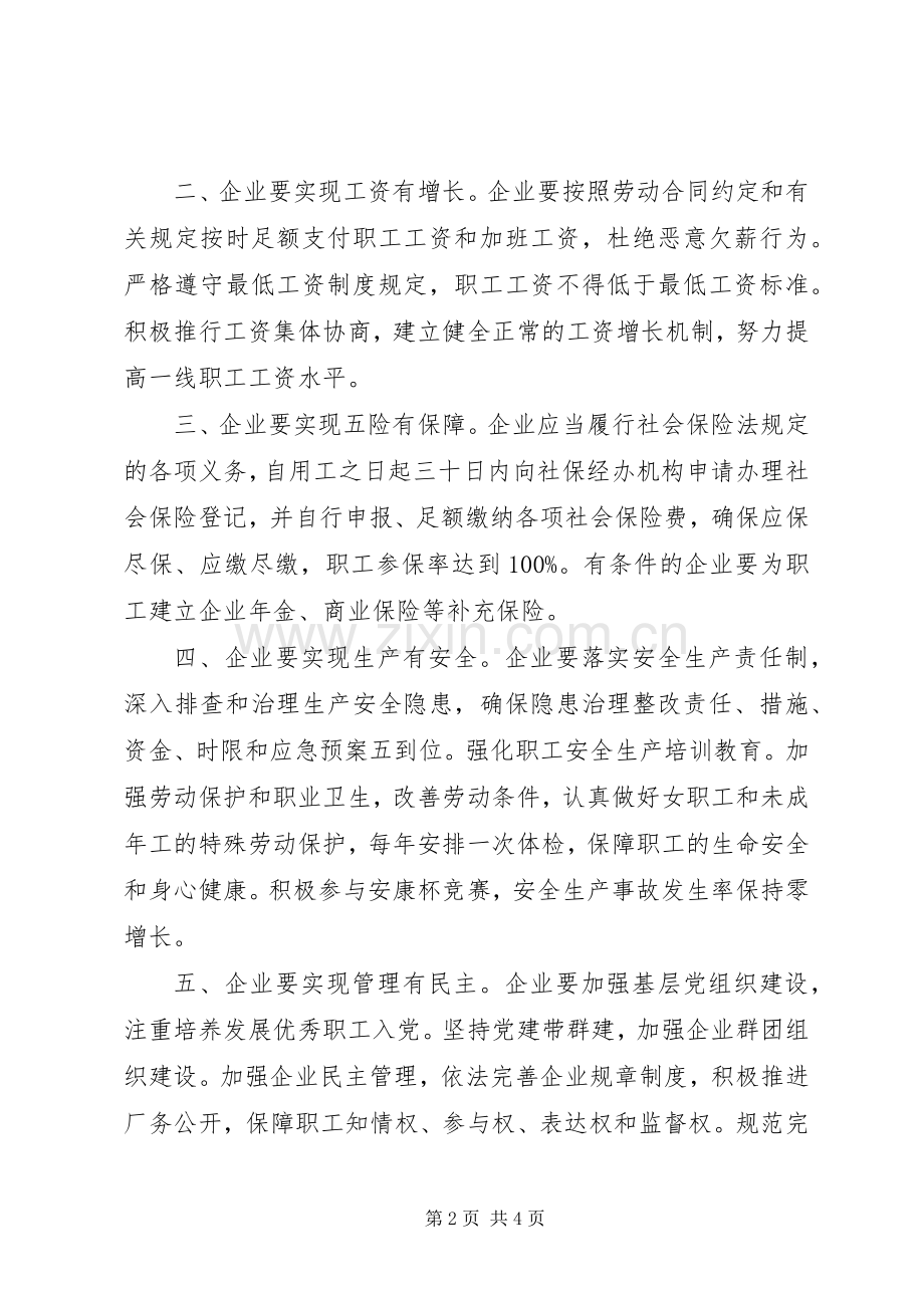二、企业要实现工资有增长。企业要按照劳动合同约定和有关规定按时足额支付职工工资和加班工资,杜绝恶意欠薪行为。严格遵守最低工资制度规定,职工工资不得低于最低工资标准。积极推行工资集体协商,建立健全正常的工资增长机制,努力提高一线职工工资水平。