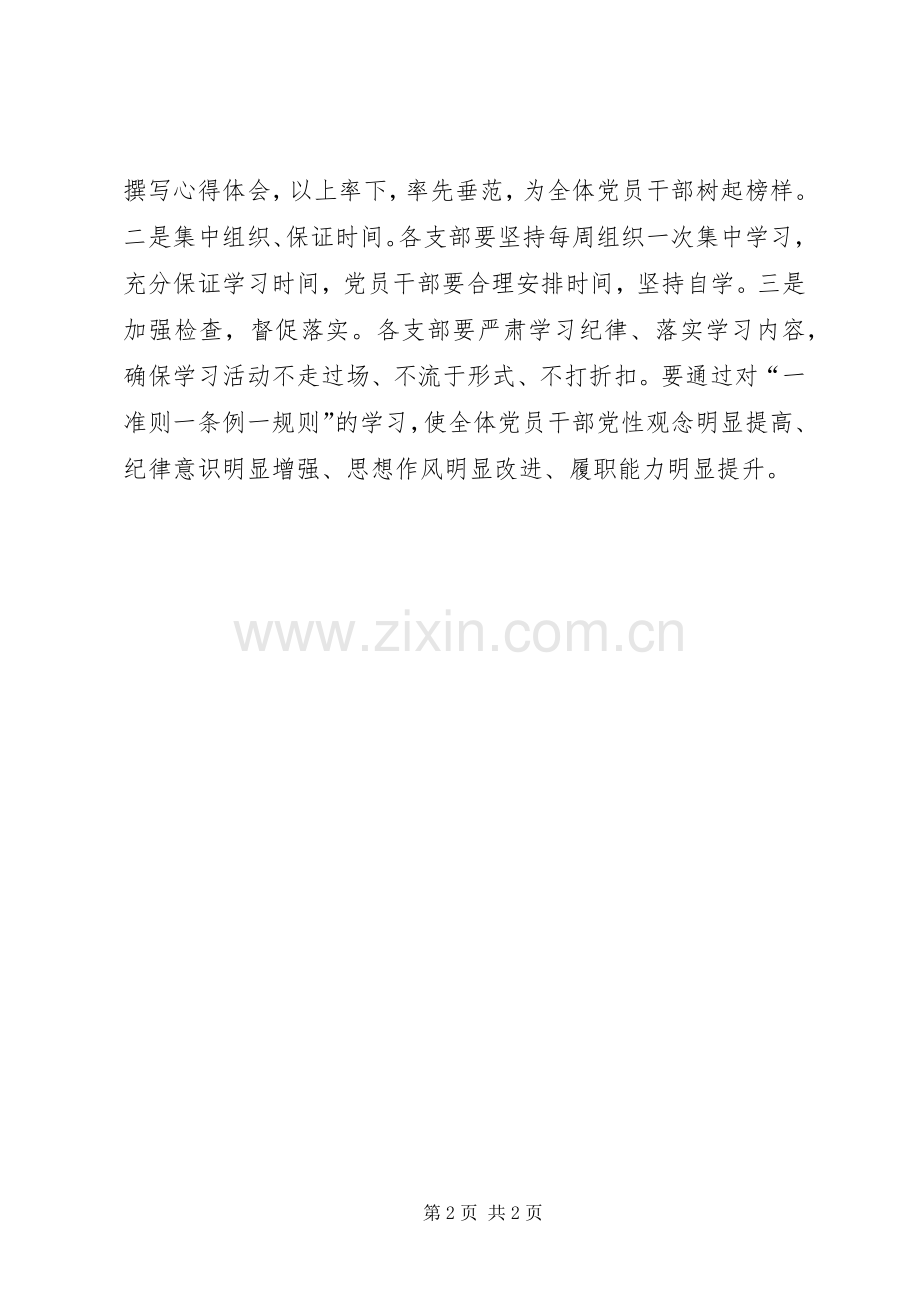 三要认真组织,确保学习的效果。一是带头学习、树起榜样。各支部书记要发挥好第一责任人的作用,认识要高、责任要强、行动要快,带头学习,先学一步、学深一层,带头做好学习笔记、撰写心得体会,以上率下,率先垂范,为全体党员干部树起榜样。二是集中组织、保证时间。各支部要坚持每周组织一次集中学习,充分保证学习时间,党员干部要合理安排时间,坚持自学。三是加强检查,督促落实。各支部要严肃学习纪律、落实学习内容,确保学习活动不走过场、不流于形式、不打折扣。要通过对“一准则一条例一规则”的学习,使全体党员干部党性观念明显提高、纪律意识明显增强、思想作风明显改进、履职能力明显提升。