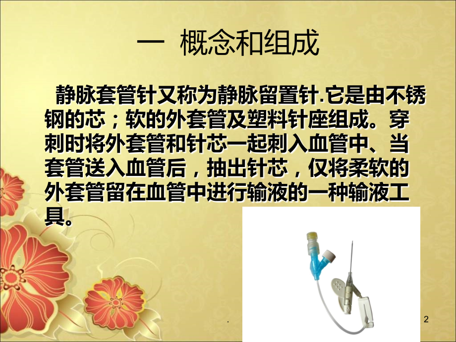 单击此处编辑母版标题样式,单击此处编辑母版文本样式,第二级,第三级,第四级,第五级,.,*,浅静脉留置针,1,.,一 概念和组成,静脉套管针又称为静脉留置针,.,它是由不锈钢的芯;软的外套管及塑料针座组成。穿刺时将外套管和针芯一起刺入血管中、当套管送入血管后,抽出针芯,仅将柔软的外套管留在血管中进行输液的一种输液工具。,2,.,小夹子,针柄,针尖,肝素帽,白色隔离塞,延长管,导管,留置针基本组成,小夹子,3,.,二 留置针的种类,开放式留置针,密闭式留置针,安全型留置针,防逆流留置针,4,.,开放式留置针,在临床使用时相比其他型号留置针提供,较大输液量,,但不能完全有效避免血液外溢的传统的留置针,5,.,密闭式留置针,能在使用过程中,有效避免血液外溢而造成血液污染的,整体式留置针,。,直型,Y,型,6,.,安全留置针,在临床使用过程中,达到防针尖刺伤、避免血液污染、既防针刺伤又防血液污染的安全型留置针,7,.,防逆流留置针,在临床使用过程中,防止血液逆流,减低血液污染的危险,达到正压封管效果,减轻工作量的先进的留置针,8,.,静脉留置针参数与适应范围,流速,应用,1925ml/min,小儿,/,脆小血管,3336ml/min,输液,5565ml/min,输血,76105ml/min,手术室,/,急诊,头皮针,5#,7#,9#,12#,规格,24G,22G,20G,18G,颜色,9,.,三 静脉留置针的优点,操作简单,,减轻患者,由于反复穿刺而造成的,痛苦,保护血管,,减少液体外渗,同时保证合理用药时间,为输血和输液提供方便,保留了一条开放的静脉通路,便于,抢救,工作,而且很大程度上减轻了护理人员的工作量,适合于,长期,输液患者、,老年人,患者及,无自主意识,的患者,特别是危重患者,可随时打开静脉通道及早用药,,提高抢救成功率,10,.,四,静脉留置针的操作,针外套管,操作者左手绷紧皮肤,,,根据患者病情、治疗、年龄及血管情况的需要分别选择,18 G,24 G,等型号,选择粗、直、血流量丰富、有弹性、无静脉窦且远离关节、活动方便、易于固定的血管,对能下床活动患者不宜选用下肢静脉。协助患者采取舒适体位,在穿刺点上方,10,15 cm,处扎止血带,以进针点为中心,皮肤常规消毒,直径为,6,8 cm,,,穿刺前检查好留置针,严格无菌操作,松动留置,11,.,右手拇指、示指持留置针柄与皮肤呈,15,30,角进针,直刺静脉,进针速度宜慢,见回血后退针芯,1,2 mm,至外套管内,再将外套管缓慢送入血管内,松开止血带,拔出针芯,穿刺成功后,将透明的无菌贴膜固定在穿刺部位,使留置针固定更牢固。操作过程中密切观察患者,及时沟通转移患者注意力。将输液器一端与肝素帽连接,根据患者病情调节滴速,观察局部有无渗漏,输液是否通畅。,12,.,五 常见并发症及预防,1,、,皮下血肿,:穿刺及置管操作不熟练、技术掌握不好、操之过急、动作不稳等,往往容易使置管针穿过血管壁而形成皮下血肿。因此,护理人员应熟练掌握穿刺技术,穿刺时动作应轻、巧、稳、准。根据不同的血管情况把握好进针角度,提高一次性穿刺成功率,以有效避免或减少皮下血肿的发生。,2,、液体渗漏,:血管选择不当、进针角度过小、固定不牢、病人躁动不安、外套管未完全进入血管内或血管壁接触面积过大等原因均可导致液体外漏。护理人员除加强训练外,应妥善固定导管,嘱病人避免留置针肢体过度活动,,13,.,必要时可适当约束肢体;嘱病人保持输液肢体与心脏平齐或抬高,同时注意穿刺部位上方衣服勿过紧,避免影响局部血液回流。并加强穿刺部位的观察及护理;合理选择血管,尽量选择较粗,弹性较好的血管,避免在靠近神经、韧带关节的手腕和手背肘窝部位的血管输液,不用末梢循环差的血管;避免在患侧肢体上进行穿刺;严格掌握输液速度和方法,对于血管刺激性强的药物,如“氯化钾”、血管活性药物等,输液速度要慢;如输入粘稠度较大的药物,如,20%,甘露醇、脂肪乳等,输入前后均要用生理盐水冲管,一般液体输液速度可稍快。,14,.,3,、导管堵塞,:造成导管堵塞的原因较为复杂,通常与静脉高营养输液或导管冲洗不彻底、管液种类量及推注速度选择不当以及病人的凝血机制异常等有关。因此,在静脉营养输液后应彻底冲洗管道,每次输液毕要正确封管,需根据病人的具体情况选择合适的封管液及用量。并注意推注速度不可过快,有研究说明,缓慢推注堵管率明显低于快速推注。因此,在输液过程中导管堵塞是常困扰护士和病人的主要问题。,15,.,4,、静脉炎,:常见症状为穿刺部位血管红、肿、热、痛,触诊时静脉如绳索般硬、滚、滑、无弹性,严重者局部针眼挤出脓性分泌物,并可伴有发热等全身症状。护理人员应注意各操作环节的严格无菌,选择静脉尽量从远端开始,力争一次穿刺成功。输注对血管刺激性较强的药物前后应用生理盐水进行冲洗,以减少静脉炎的发生。发现静脉炎患者应立即拔管,嘱患者抬高患肢,以促进静脉血回流缓解症状。同时在肿胀部位用硫酸镁或土豆片湿敷,20min/,次,,4,次,/,天效果较好。,16,.,5,、静脉血栓的形成,:静脉血栓多见于血流缓慢的静脉内。根据报道,久病卧床病人发生在下肢静脉的血栓比上肢静脉的血栓多,3,倍。另外,反复多次在同一部位用留置针进行静脉穿刺的血管壁损伤,也是血栓形成的促发因素。为防止静脉血栓形成,对长期卧床的病人应尽量避免在下肢远端使用静脉留置针,且留置时间不能过长,常规留置时间为,5,天。,17,.,六 封管液的配置及使用方法,1,、肝素