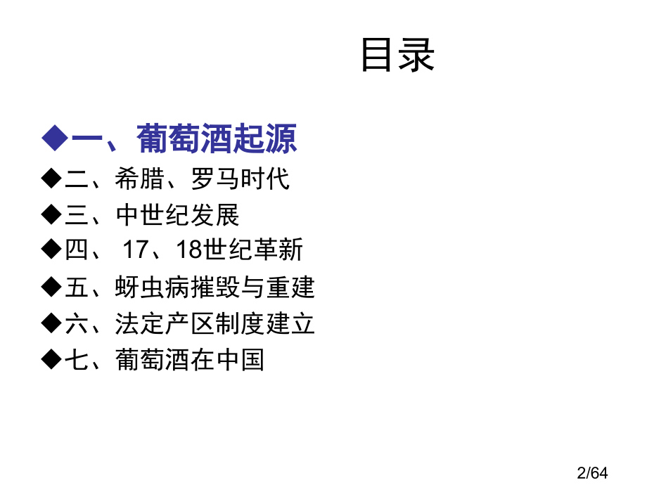单击此处编辑母版标题样式,单击此处编辑母版文本样式,第二级,第三级,第四级,第五级,本资料仅供参考,不能作为科学依据。谢谢。本资料仅供参考,不能作为科学依据。本资料仅供参考,不能作为科学依据。谢谢。本资料仅供参考,不能作为科学依据。,葡萄酒历史,1/64,目录,一、葡萄酒起源,二、希腊、罗马时代,三、中世纪发展,四、17、18世纪革新,五、蚜虫病摧毁与重建,六、法定产区制度建立,七、葡萄酒在中国,2/64,葡萄酒起源,葡萄酒能够自然产生,不一定要人工酿造,所以葡萄酒历史相当久远,推估在史前时代就已经存在。因为当野生葡萄熟透落地后,只要葡萄汁和葡萄皮接触,附在葡萄皮上天然酵母,便会自动开始将葡萄汁中糖分发酵成葡萄酒。,酿酒原理即使简单,但葡萄酒在伴伴随人类历经了数千年历史变迁之后,已发展成全世界最复杂饮料。葡萄酒历史几乎和欧洲文明历史发展紧密地结合在一起,直到当代成为全球性饮料。,3/64,葡萄酒起源,人类采摘野生葡萄酿酒历史能够追溯到史前时代,年代已不可考。在距今最少60前,黑海与里海间外高加索地域,人类开始种植葡萄,酿制葡萄酒。而且,最关键是,当初采取葡萄属于欧洲葡萄(Vitis Vinifera)品种,和当前全球数以千计酿酒葡萄品种相同,据推断是全部酿酒葡萄祖先。这个品种果粒大、糖分高,尤其美味,也适合酿酒,于是由外高加索先传到土耳其,在5000多年前传到两河流域和埃及,并在公元前25传到了爱琴海,然后再由腓尼基人和希腊人将葡萄带往地中海沿岸及西欧。,4/64,葡萄酒起源,苏美尔人是最早开始酿造葡萄酒古文明之一,公元前3000多年前,他们用人工浇灌方式开辟葡萄园,酿造葡萄酒。在埃及发展出更繁复葡萄酒酿造技术,葡萄用棚架种植,集中在尼罗河三角洲,采收葡萄用脚踩出果肉后榨汁,在酒糟或陶瓶中发酵,当初葡萄酒相当稀有宝贵,属于神,国王和贵族饮料,含有浓厚宗教与政治意义,蕴含着死亡与再生、靠近神性以及生殖等多重意义,并常被作为祭神用具,而且只能为社会精英在餐会中独享。,5/64,古埃及,古埃及贵族们墓室里,生动细腻地勾勒着与葡萄酒相关图画,从公元1550年开始,著名图坦卡门法老陵墓中发觉葡萄酒罐上刻有十分明确标注,年份、葡萄园和酿酒商名号。,实际上如今埃及,已经无法酿造出上好葡萄酒。,6/64,古埃及壁画,古埃及人壁画上清楚地描述了葡萄酒酿制过程,从采集葡萄,到品尝成品。,7/64,故事传说,相传在很久很久以前,葡萄酒因为偶然机会在波斯古国(今伊朗)诞生。当初国王妃常喜欢吃葡萄,总是把吃不完葡萄密封在一个罐子中,并写上“毒药”字样,以防他人偷吃;不料却被他一个妃子发觉,当初那个曾集万千溺爱于一身妃子,已被打入冷宫,往日恩宠和繁荣不过一梦,看着是“毒药”,便喝了下去,只求速死。喝下去之后却只以为那半透明绛色液体在口舌中、心肺间游走,孕出微香,竟是前所未有恬然陶醉。便将其献与国王,深得国王欢心,又再度受宠。今后这美好“毒药”葡萄酒便流传四方,一直蔓延到整个五大洲。,多数历史学家认为波斯(即今日伊朗)是最早酿造葡萄酒国家。,8/64,葡萄起源与传输线路图,中东里海,美索布达米亚,公元5000前,古埃及,公元25前,古希腊,公元16前,古罗马帝国,公元10前,法国高卢,西班牙,德国,奥地利,葡萄牙,公元4前至公元1,公元1400-16,南非,墨西哥,阿根廷,1769,加利福尼亚(美国),澳大利亚,新西兰,1788-1819,9/64,葡萄起源与传输线路图,10/64,目录,一、葡萄酒起源,二、希腊、罗马时代,三、中世纪发展,四、17、18世纪革新,五、蚜虫病摧毁与重建,六、法定产区制度建立,七、葡萄酒在中国,11/64,希腊、罗马时代,距今4000多年前,经过克里特岛上迈诺安人,葡萄及葡萄酒酿造技术自埃及传入希腊。葡萄酒逐步成为希腊文化中相当主要元素,在希腊及爱琴海岛屿上处处都有种植葡萄。而且当初葡萄酒已经成为相当主要贸易商品,除了当地自用外,也用双耳尖底陶瓶运销到地中海沿岸各地。居住在黎巴嫩一带腓尼基人和希腊人一样,不但向外拓展贸易,也沿着地中海岸建立了许多海外殖民地,葡萄被快速地传到黑海沿岸以及地中海西部,包含北非、西西里、意大利南部、法国南部等地都开始种植葡萄酿酒。希腊之后罗马更借助兵团势力,将葡萄种植传输到欧洲各地,几乎现在欧洲主要葡萄园在罗马时期就已建立。,12/64,希腊、罗马时代,在希腊时期,葡萄酒即使还是被用来作为祭奠用具,但已经成为普通人饮品,而且在希腊酒宴以及春天连续三天酒节中饰演主角。葡萄酒在当初也被赋予医药功效。在希腊和罗马时期,葡萄酒都有一个直接相关神。希腊时期酒神狄奥尼索斯(Dionysus)含有疯狂象征意义,暗示着对理性和文明威胁,同时也表示享乐以及人类本性中属于动物性一面。罗马酒神名为巴克斯(Bacchus),所代表象征意义变得比较狭隘,只直接和葡萄酒联络起来。,13/64,古希腊,荷马史诗最早用文字形式统计了葡萄酒。,公元前5世纪,希腊历史学家希德狄斯写道:“地中海沿岸居民自从学会种植橄榄和葡萄那一天起,才开始走向文明。”,古希腊,一年一度都举行酒神节,祭奠酒神,品尝最好美酒,观看戏剧演出,狄奥尼索斯酒神,14/64,古罗马,国势日强罗马征服了整个地中海地域,自己却被葡萄酒所征服。,伴随罗马军队南征北战,葡萄酒也香飘欧洲各地。,罗马人天生偏好珍品,酷爱葡萄酒,其