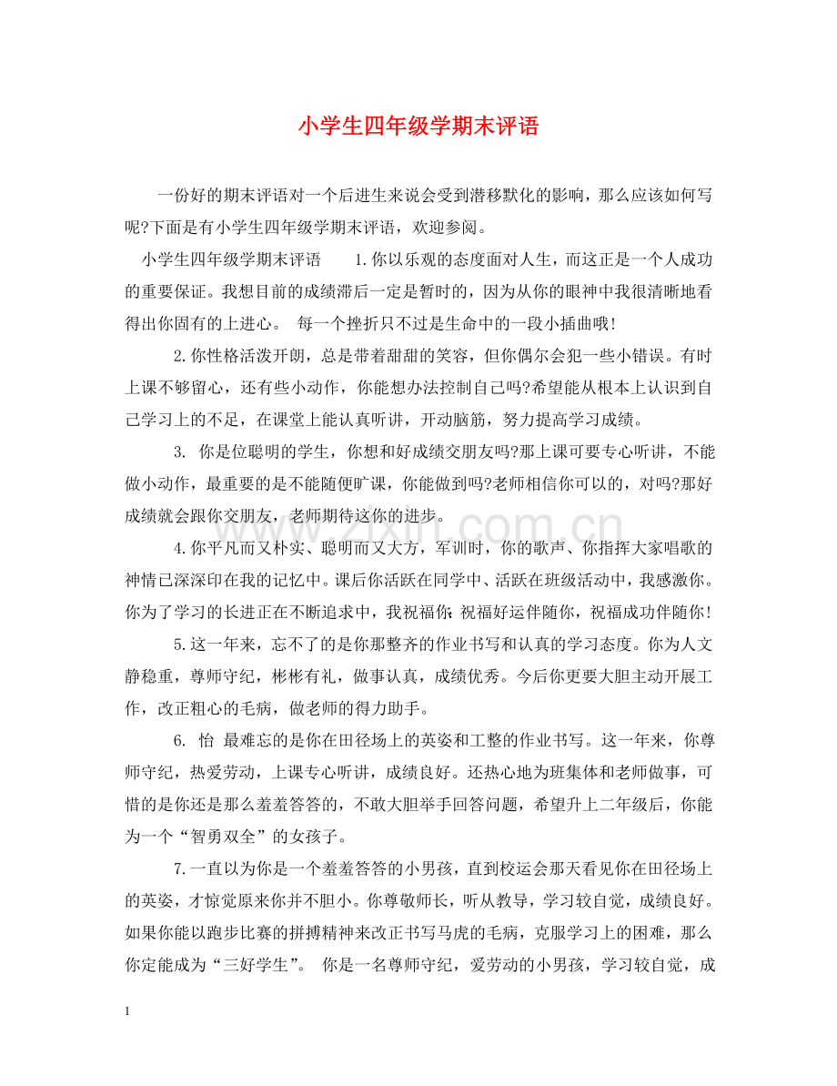 小学生四年级学期末评语精选 1. 你是一个上进心强,自尊心也很强,聪明而且心地善良的女孩。你有一颗纯真的心,能与同学友爱相处。但有时在你遇到挫折时候,缺乏克服困难的信心,只能付之眼泪。你要知道在通往知识的顶峰的路上长满了荆棘,望你克服困难,勇往直前!