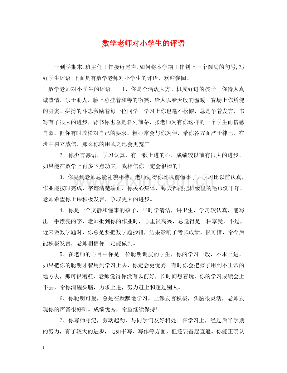 一到学期末,班主任工作接近尾声,如何将本学期工作划上一个圆满的句号,写好学生评语;下面是有数学老师对小学生的评语,欢迎参阅。
