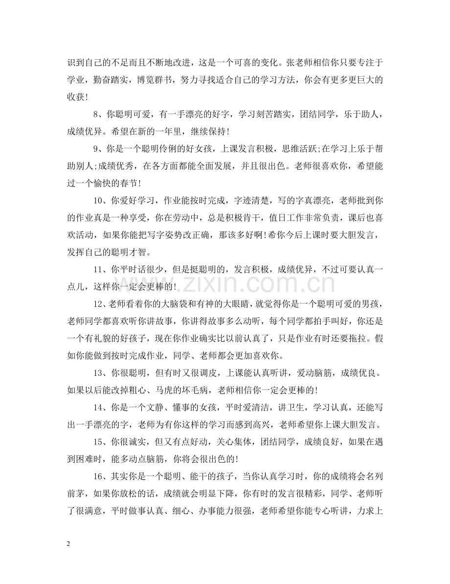 22、你聪明可爱,勤奋好学,上课认真听讲,发言积极,与同学和睦相处,热爱劳动,成绩优异,是老师的好学生。希望在新的一年里,能再接再厉!