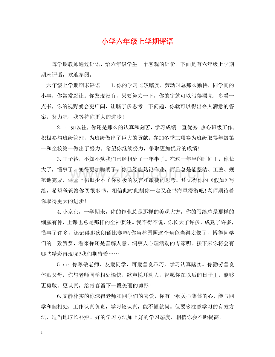 每学期教师通过评语,给六年级学生一个客观的评价。下面是有六年级上学期期末评语,欢迎参阅。