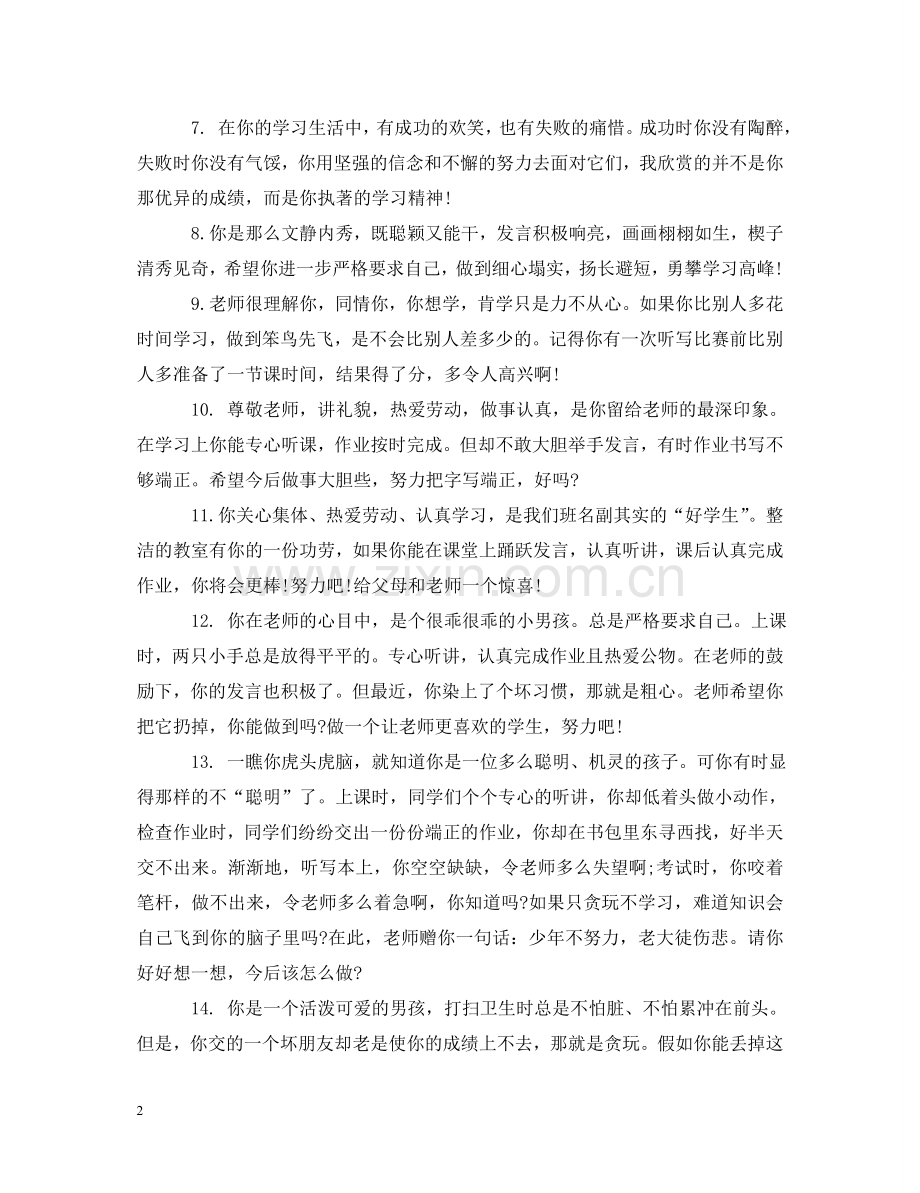 7. 你是一个朴实的孩子。你脚踏实地、勤奋好学,本学期成绩有所进步,但是你也要知道学习不是死记硬背,还要讲究方法、技巧。学习上有不懂的问题,不要羞于开口,要多问,多思考,多练习。老师相信:只要你信心不倒,努力不懈,终有一天会到达成功的彼岸!