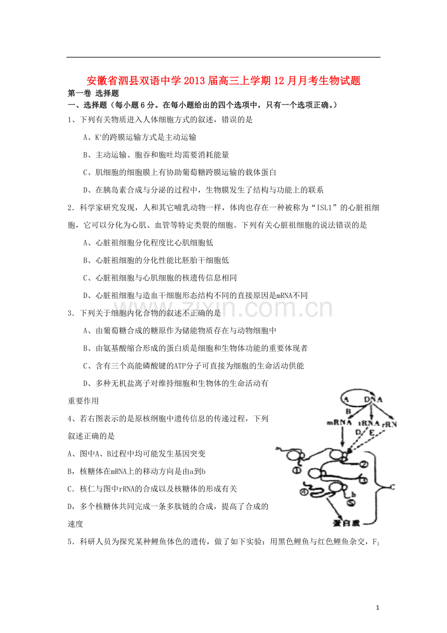 安徽省泗县双语中学2013届高三上学期12月月考生物试题