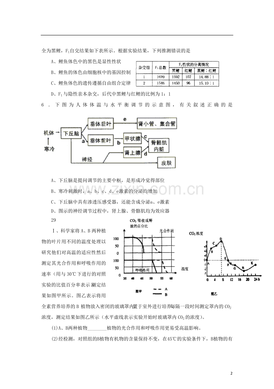 5.科研人员为探究某种鲤鱼体色的遗传,做了如下实验:用黑色鲤鱼与红色鲤鱼杂交,F1全为黑鲤,F1自交结果如下表所示。根据实验结果,下列推测错误的是