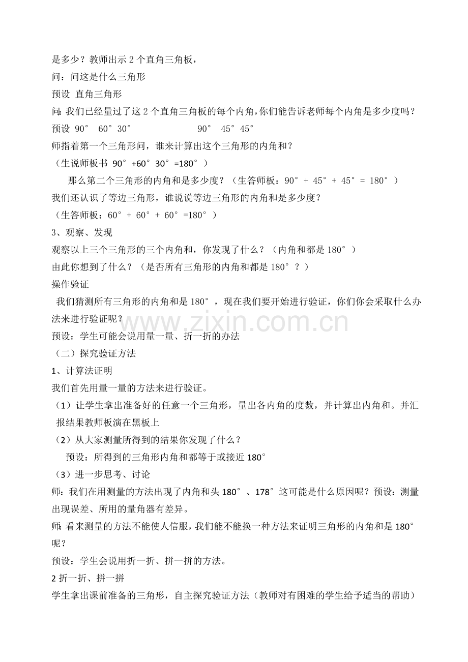 教学重点:探索和发现三角形内角和等于180°。