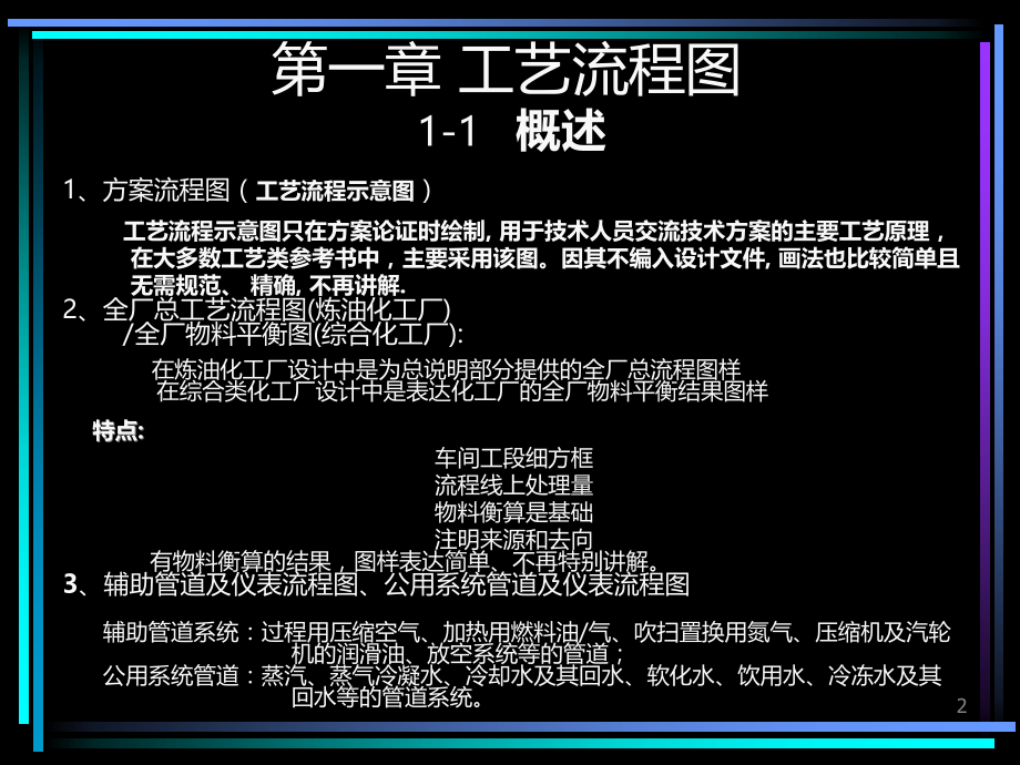 单击此处编辑母版标题样式,单击此处编辑母版文本样式,第二级,第三级,第四级,第五级,*,第一篇 化工工艺图,化工企业设计是由多方面专业人员共同配合,相互协作完成的,.,工艺人员的主要任务是进行化工工艺设计,提供工艺图样,并据此向其它专业提出工艺条件,.,工艺人员还应及时有效地与其它专业进行沟通,提供方便,协助其它专业的设计工作,最后,工艺人员还要根据其它专业的设计资料和图样,修改和最后完成化工工艺图样,.,化工工艺图,:,主要参考标准,:,国家标准,GB6567.1.5,工艺流程图,:,方案流程图,总工艺流程图,/,物料平衡图,、,物料流程图,工艺管道及仪表流程图,(,辅助管道及仪表,流程图 公用系统管道及仪表流程图,),设备布置图,管道布置图,1,第一章 工艺流程图,1-1,概述,1,、方案流程图(,工艺流程示意图,),工艺流程示意图只在方案论证时绘制,用于技术人员交流技术方案的主要工艺原理,在大多数工艺类参考书中,主要采用该图。因其不编入设计文件,画法也比较简单且无需规范、精确,不再讲解,.,2,、全厂总工艺流程图,(,炼油化工厂,),/,全厂物料平衡图,(,综合化工厂,):,在炼油化工厂设计中是为总说明部分提供的全厂总流程图样,在综合类化工厂设计中是表达化工厂的全厂物料平衡结果图样,特点,:,车间工段细方框,流程线上处理量,物料衡算是基础,注明来源和去向,有物料衡算的结果,图样表达简单、不再特别讲解。,3,、辅助管道及仪表流程图、公用系统管道及仪表流程图,辅助管道系统:过程用压缩空气、加热用燃料油,/,气、吹扫置换用氮气、压缩机及汽轮,机的润滑油、放空系统等的管道;,公用系统管道:蒸汽、蒸气冷凝水、冷却水及其回水、软化水、饮用水、冷冻水及其,回水等的管道系统。,2,1-2,物 料 流 程 图,一,.,作用与内容,以图形与表格相结合的形式反映工艺计算某些结果的图样,.,通常在完成物料衡算和热量衡算后绘制,.,提供审查资料,是进一步设计的依据,生产操作时参考。,画法:,以车间为单位,采用展开图形式,按工艺流程顺序从左到右,依次画出设备简图,物料流程线,标注说明,.,内容:,1,)设备示意简图(细实线),:,符合标准(,GB6567.1-86,或,HG20519.31-92,),2,)流程线,:,(粗实线,bb/2,,工艺图,b=0.91.2,为宜),3,)标注:设备位号,名称及特性数据;流程物料的名称,,组分和流量(表格),4,)标题栏:图名,图号和设计阶段等。,5,)比例与图幅:可不按比例,常采用,A1,或加长,A2,、,A3,的,长边幅面或分张绘制,。,3,二,.,设备表示方法,1.,设备示意简图,:,(细实线)参见,GB6567.1-86,(书中表,7-1,),或,HG20519,31-92,换热器可简化成符号:,(箭头向上),(箭头向下),(细实折线),4,2.,设备标注:,T,101A,乙苯塔(浮阀塔),1600,52600,n=120,T,101A,设备位号(工艺图中唯一,所有图中一致)表示方法,:,设备分类代号(表,7-1,),主项代号(工程总负责人给定),设备序号(,2,位,自编),相同设备尾号(仅画一台标,A-C,),5 1 5a-c,车间序号,设备序号,相同设备尾号,设备位号,工艺用途名称,特性数据,主项代号,:企业的工艺流程不同,有的可以构成厂,车间,工段,工序的形式。也有时,对设备采用联合布置形式,分类集中,大量露天布置,构成,“,装置,”,。装置中可以再分区,整套装置也可按内容分成几个主项,每个主项还可能有几个分项。因此这里的主项代号可以是车间或工段也可以是主项或分项,。,5,三、物料流程的表示,只用带箭头的粗实线画工艺物料流程。在流程起始部分和物料产生变化后的设备后,从流程线上用细实线的指引线引出细实线列表。物料在流程中的某些参数(温度,压力等)有时在流程线旁标注。,名称,流量,/h,摩尔分数,%,1,2,3,4,5,合计,6,7,车间工段细方框,流程线上处理量,物料衡算是基础,注明来源和去向,8,车间工段是单位,流程线间连设备,组分流量用表格,生产能力要标对,9,车间装置作主项,流程管道带仪表,工艺要求图上见,阀门图例也重要,10,设备布置进厂房,标高注在剖面上,平面图上有定位,孔梯位置细思量,11,管道布置重空间,厂房设备细实线,出口位置已确定,三维定位要方便,12,
