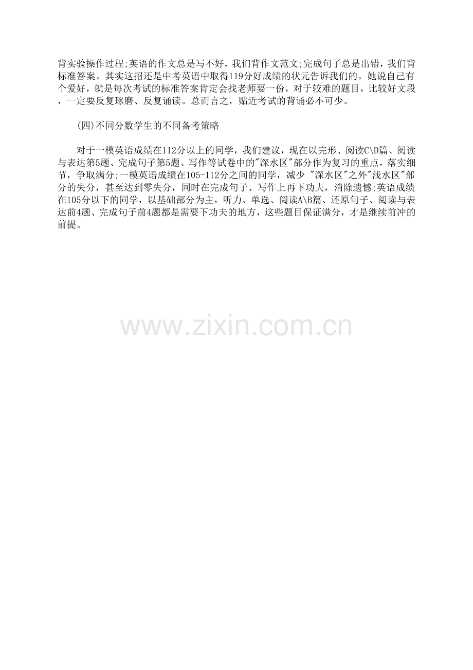 对于一模英语成绩在112分以上的同学,我们建议,现在以完形、阅读C\D篇、阅读与表达第5题、完成句子第5题、写作等试卷中的"深水区"部分作为复习的重点,落实细节,争取满分;一模英语成绩在105-112分之间的同学,减少 "深水区"之外"浅水区"部分的失分,甚至达到零失分,同时在完成句子、写作上再下功夫,消除遗憾;英语成绩在105分以下的同学,以基础部分为主,听力、单选、阅读A\B篇、还原句子、阅读与表达前4题、完成句子前4题都是需要下功夫的地方,这些题目保证满分,才是继续前冲的前提。