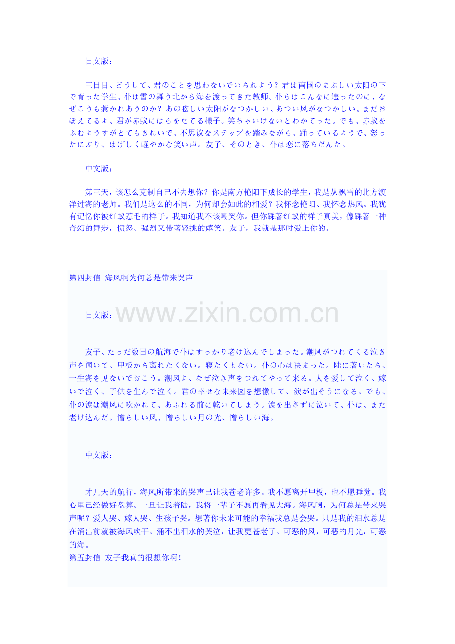 三日目、どうして、君のことを思わないでいられよう?君は南国のまぶしい太阳の下で育った学生、仆は雪の舞う北から海を渡ってきた教师。仆らはこんなに违ったのに、なぜこうも惹かれあうのか?あの眩しい太阳がなつかしい、あつい风がなつかしい。まだおぼえてるよ、君が赤蚁にはらをたてる様子。笑ちゃいけないとわかてった。でも、赤蚁をふむようすがとてもきれいで、不思议なステップを踏みながら、踊っているようで、怒ったにぶり、はげしく軽やかな笑い声。友子、そのとき、仆は恋に落ちだんた。