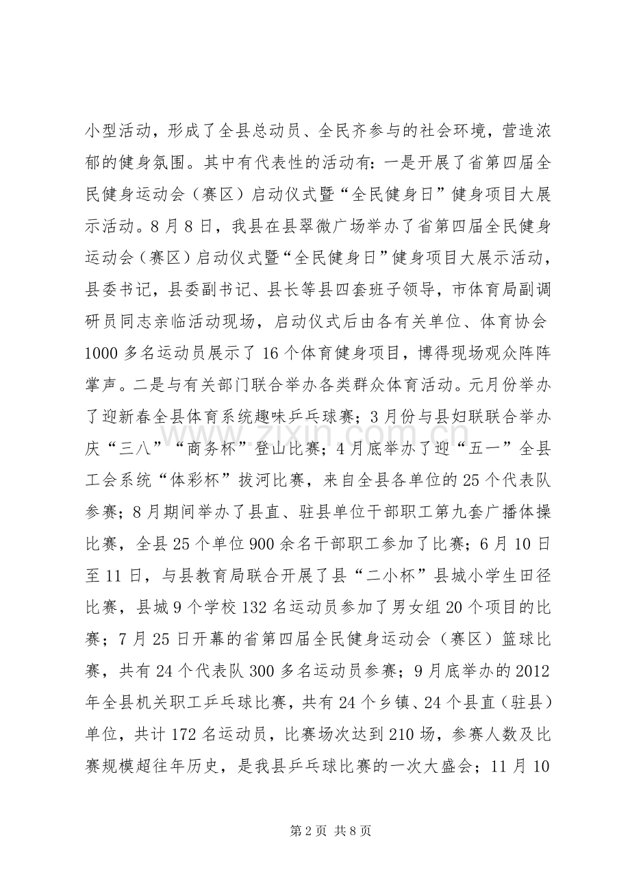 1、联合有关部门多形式、多渠道开展各类全民健身活动。我县以“全民健身日”活动为契机,因地制宜,精心组织安排内容丰富、形式多样、突出本地特色、群众喜闻乐见的各类大、中、小型活动,形成了全县总动员、全民齐参与的社会环境,营造浓郁的健身氛围。其中有代表性的活动有:一是开展了省第四届全民健身运动会(赛区)启动仪式暨“全民健身日”健身项目大展示活动。8月8日,我县在县翠微广场举办了省第四届全民健身运动会(赛区)启动仪式暨“全民健身日”健身项目大展示活动,县委书记,县委副书记、县长等县四套班子领导,市体育局副调研员同志亲临活动现场,启动仪式后由各有关单位、体育协会1000多名运动员展示了16个体育健身项目,博得现场观众阵阵掌声。二是与有关部门联合举办各类群众体育活动。元月份举办了迎新春全县体育系统趣味乒乓球赛;3月份与县妇联联合举办庆“三八”“商务杯”登山比赛;4月底举办了迎“五一”全县工会系统“体彩杯”拔河比赛,来自全县各单位的25个代表队参赛;8月期间举办了县直、驻县单位干部职工第九套广播体操比赛,全县25个单位900余名干部职工参加了比赛;6月10日至11日,与县教育局联合开展了县“二小杯”县城小学生田径比赛,县城9个学校132名运动员参加了男女组20个项目的比赛;7月25日开幕的省第四届全民健身运动会(赛区)篮球比赛,共有24个代表队300多名运动员参赛;9月底举办的2012年全县机关职工乒乓球比赛,共有24个乡镇、24个县直(驻县)单位,共计172名运动员,比赛场次达到210场,参赛人数及比赛规模超往年历史,是我县乒乓球比赛的一次大盛会;11月10日-11日,举办县第一届“苏区振兴杯”乒乓球邀请赛,赣闽两省三市12个县(市)乒乓球代表队参赛。