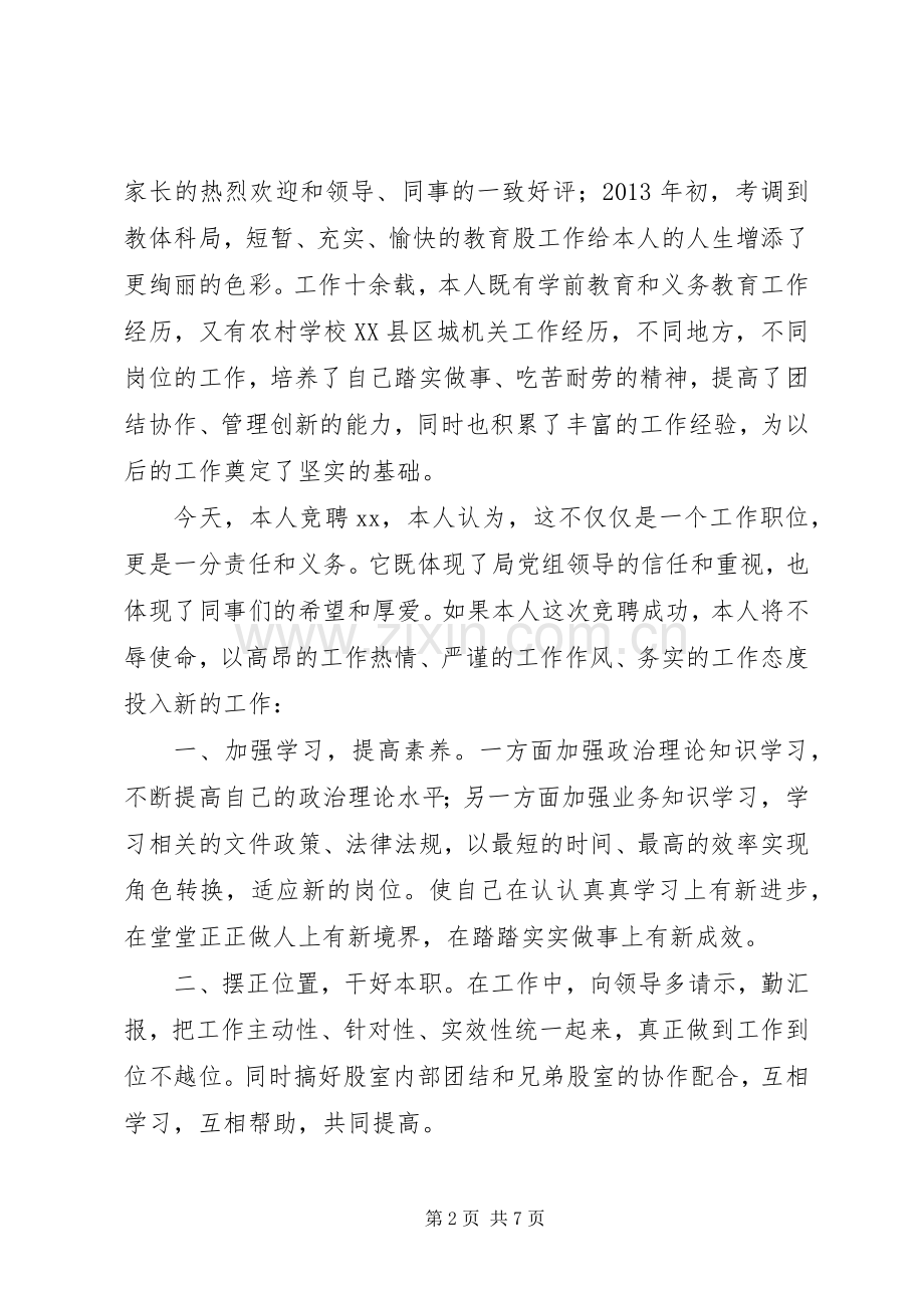 今天,本人竞聘xx,本人认为,这不仅仅是一个工作职位,更是一分责任和义务。它既体现了局党组领导的信任和重视,也体现了同事们的希望和厚爱。如果本人这次竞聘成功,本人将不辱使命,以高昂的工作热情、严谨的工作作风、务实的工作态度投入新的工作: