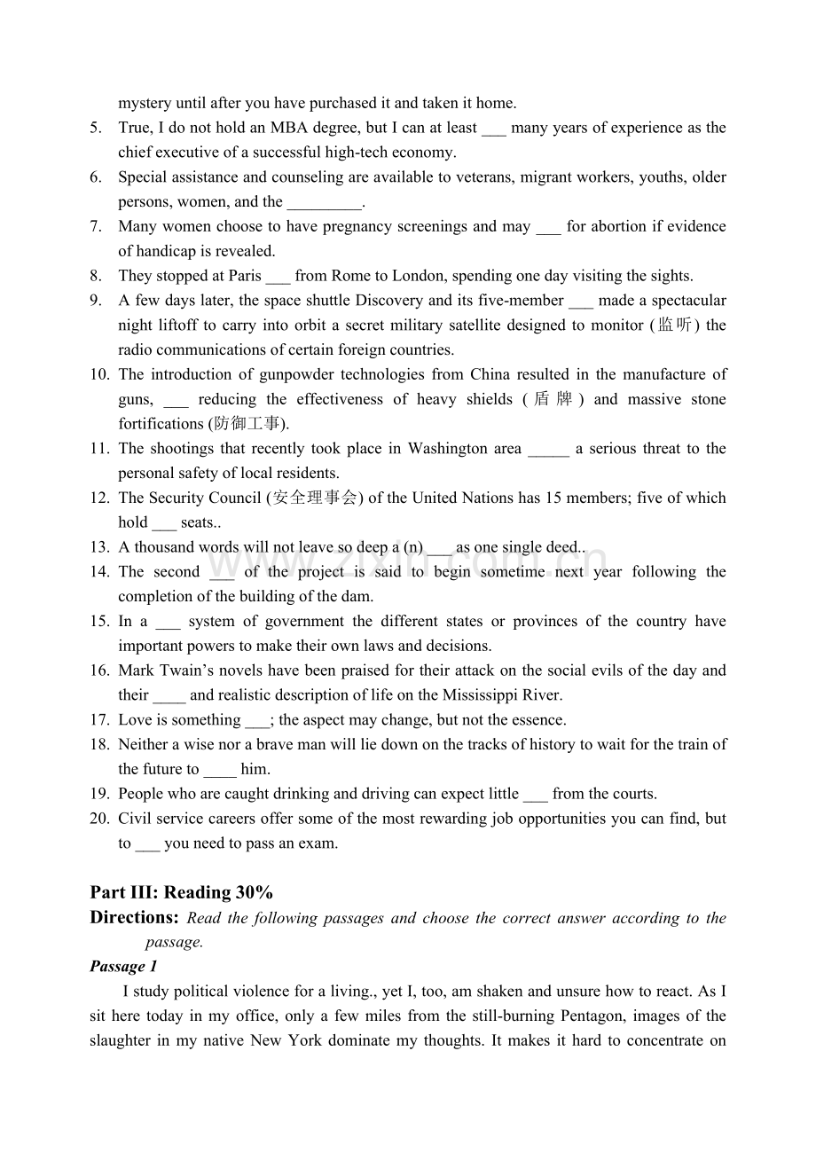 Directions: For each of the following blanks, four choices are given. Choose the best word or phrase for each blank and mark A, B, C, or D on Answer Sheet.