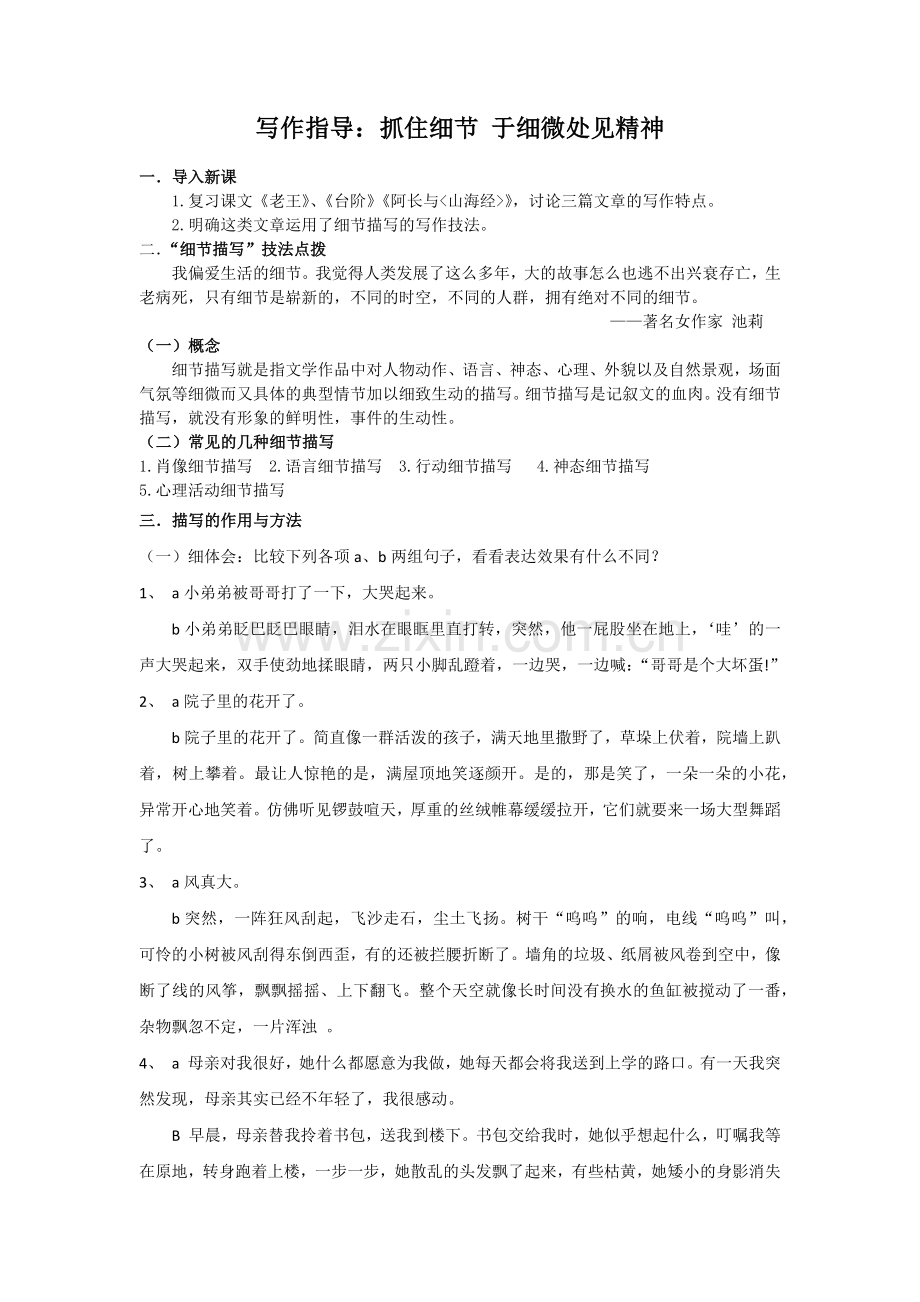 细节描写就是指文学作品中对人物动作、语言、神态、心理、外貌以及自然景观,场面气氛等细微而又具体的典型情节加以细致生动的描写。细节描写是记叙文的血肉。没有细节描写,就没有形象的鲜明性,事件的生动性。