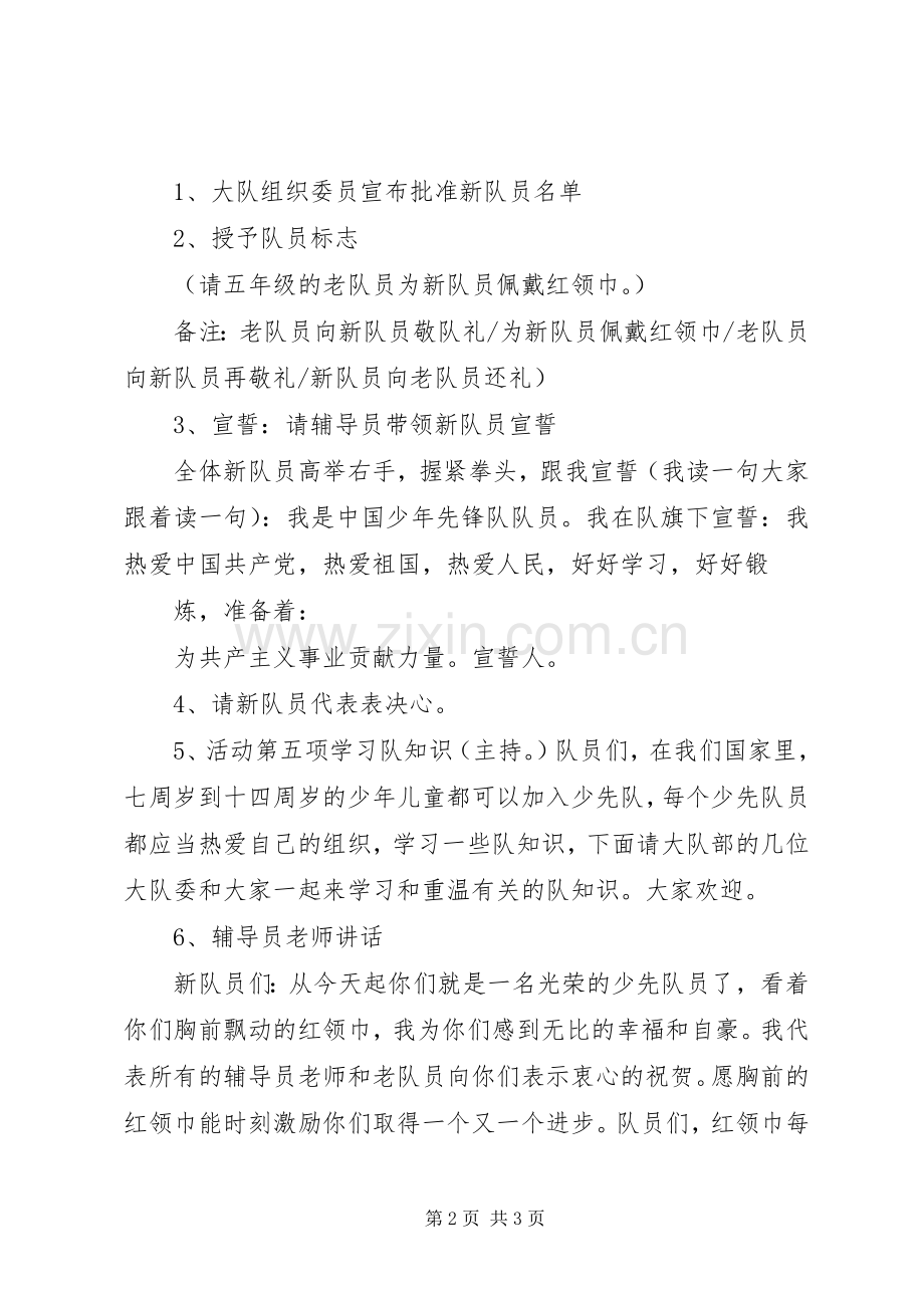 1、按市、县少工委《通知》要求,通过精心安排的队前教育、庄严隆重的入队仪式等活动,让新队员们在校园里度过一个愉快而有意义的入队日,让老队员们感受“红领巾”的快乐。