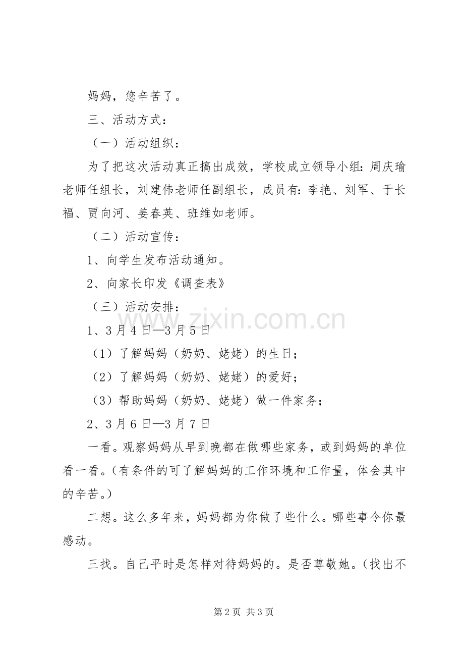 为了培养学生的基本道德观念和社会责任感,养成良好的行为习惯。在“三八”妇女节之际,特举办本次活动。通过本次活动,让学生充分了解母亲,真正从内心感到母亲对家庭的付出,对自己的关爱,培养学生尊重长辈、孝敬父母的传统美德以及关心他人、热爱劳动的良好习惯。