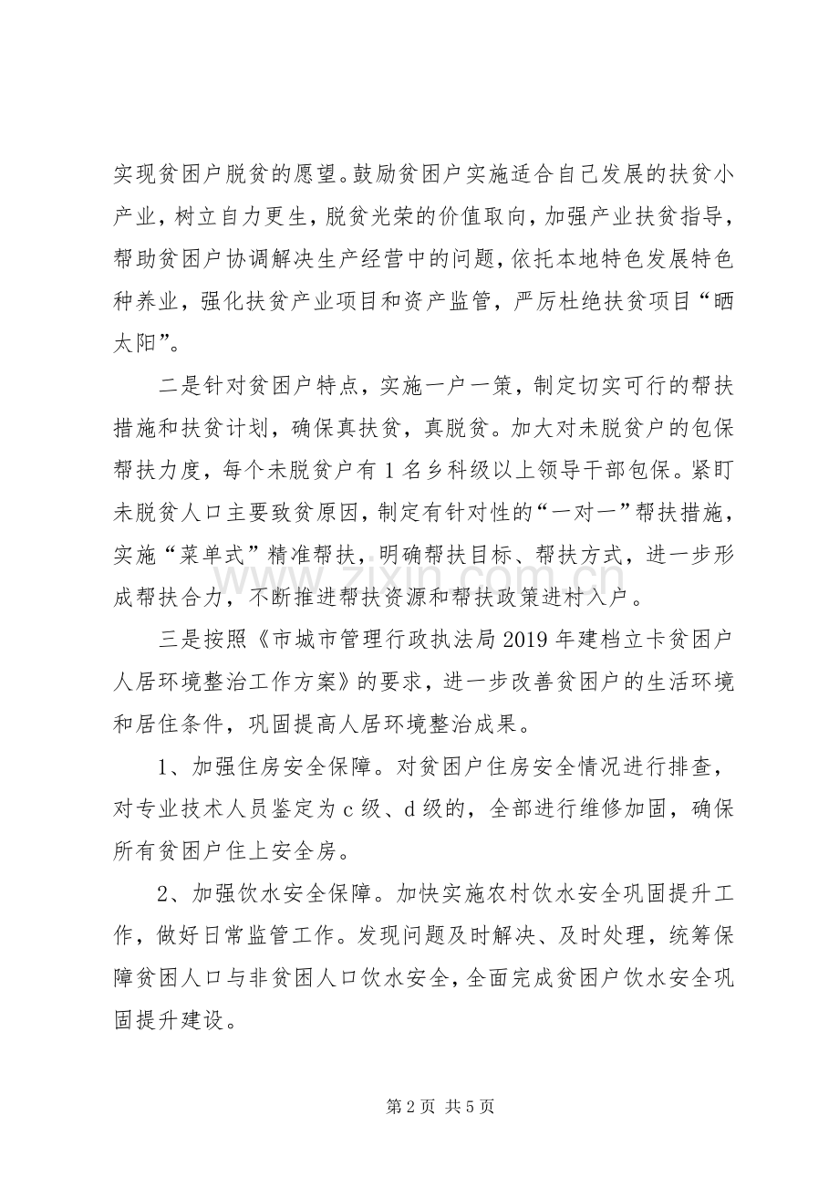 三是按照《市城市管理行政执法局2019年建档立卡贫困户人居环境整治工作方案》的要求,进一步改善贫困户的生活环境和居住条件,巩固提高人居环境整治成果。