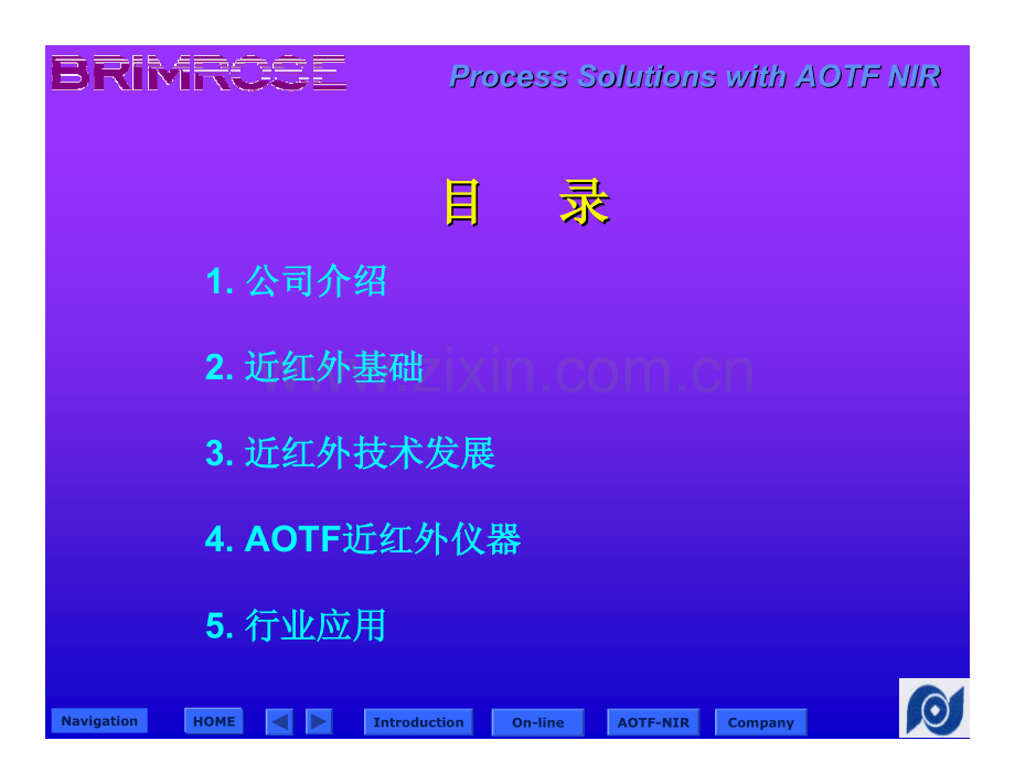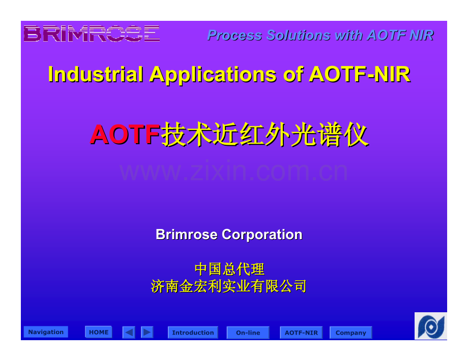 Process Solutions with AOTF NIRProcess Solutions with AOTF NIRNavigationHOMEIntroductionOn-lineAOTF-NIRCompanyIndustrial Applications of AOTFIndustrial Applications of AOTF-NIRNIRAOTFAOTF技术近红外光谱仪技术近红外光谱仪技术近红外光谱仪技术近红外光谱仪BrimroseBrimrose CorporationCorporation中中中中国总代理国总代理国总代理国总代理济南金宏利实业有限公司济南金宏利实业有限公司济南金宏利实业有限公司济南金宏利实业有限公司Process Solutions with AOTF NIRProcess Solutions with AOTF NIRNavigationHOMEIntroductionOn-lineAOTF-NIRCompany目目目目录录录录1.公司介绍公司介绍2.近红外基础近红外基础3.近红外技术发展近红外技术发展4.AOTF近红外仪器近红外仪器5.行业应用行业应用Process Solutions with AOTF NIRProcess Solutions with AOTF NIRNavigationHOMEIntroductionOn-lineAOTF-NIRCompany济南金宏利实业有限公司济南金宏利实业有限公司济南金宏利实业有限公司济南金宏利实业有限公司美国美国美国美国BRIMROSEBRIMROSEBRIMROSEBRIMROSE公司中国总代理公司中国总代理公司中国总代理公司中国总代理?济南金宏利实业有限公司成立于济南金宏利实业有限公司成立于19971997年,是独立法人企年,是独立法人企业。业。?公司以雄厚的技术力量,科学的管理体系,诚信的经营理公司以雄厚的技术力量,科学的管理体系,诚信的经营理念和坚实的经济实力,获得了美国休斯公司子公司美国念和坚实的经济实力,获得了美国休斯公司子公司美国BRIMROSEBRIMROSE(布瑞莫斯)公司(布瑞莫斯)公司AOTFAOTF技术近红外光谱仪在中国技术近红外光谱仪在中国销售的总代理权,并在公司内设立技术支持中心和培训中销售的总代理权,并在公司内设立技术支持中心和培训中心。心。?公司拥有公司拥有2020位高级技术人员,其中位高级技术人员,其中3 3位博士,位博士,6 6位硕士。位硕士。?公司每年拿出收入的公司每年拿出收入的35%35%作为推广这作为推广这一全球最新一全球最新技术和持技术和持续性发展续性发展的经的经费费。Process Solutions with AOTF NIRProcess Solutions with AOTF NIRNavigationHOMEIntroductionOn-lineAOTF-NIRCompany美国美国美国美国BRIMROSEBRIMROSEBRIMROSEBRIMROSE公司简介公司简介公司简介公司简介?美国美国BRIMROSEBRIMROSE公司成立于公司成立于19811981年,是美国休斯公司的年,是美国休斯公司的全资全资子公司子公司,全球全球光光/电电技术技术领域领先者领域领先者,公司位于美国,公司位于美国马里兰马里兰州州的的巴尔巴尔的的摩市摩市。?作为美国作为美国军事军事科技科技领域合领域合作作研发单研发单位,每年位,每年享受享受30003000万万美美元元的的军方补贴军方补贴。?目前目前是是全球全球近红外光谱近红外光谱分析分析技术技术发展最快发展最快,技术,技术最新最新的公的公司。司。?其其产品产品广广泛应用泛应用于于医药、烟草、石油化工、化医药、烟草、石油化工、化学学/聚脂、聚脂、农农业业/种种子子、食品、食品/饮料、造纸、饲料、煤炭饮料、造纸、饲料、煤炭和和纺织品等工纺织品等工业业领域领域。Process Solutions with AOTF NIRProcess Solutions with AOTF NIRNavigationHOMEIntroductionOn-lineAOTF-NIRCompanyAOTFAOTF-NIRNIR用于火星探测用于火星探测用于火星探测用于火星探测Process Solutions with AOTF NIRProcess Solutions with AOTF NIRNavigationHOMEIntroductionOn-lineAOTF-NIRCompany济济南南金金宏宏利利实实业业有有限限公公司司济济南南金金宏宏利利实实业业有有限限公公司司中中国国总总代代理理授授权权书书中中国国总总代代理理授授权权书书Process Solutions with AOTF NIRProcess Solutions with AOTF NIRNavigationHOMEIntroductionOn-lineAOTF-NIRCompany什么是近红外什么是近红外什么是近红外什么是近红外?核的跃迁磁场中的自旋取向分子转动分子振动共价电子跃迁内层壳电子跃迁-射线射线射频射频微波微波红外红外NMRESRFIRMIRX 射射线线可可见见光光NIR紫外紫外相相互互作作用用范范围围Wavelengthnm780 nm2526 nmProcess Solutions with AOTF NIRProcess Solutions with AOTF NIRNavigationHOMEIntroductionOn-lineAOTF-NIRCompany近红外光谱原理近红外光谱原理近红外光谱原理近红外光谱原理近红外光谱图近红外光谱图:横坐标:吸收波长横坐标:吸收波长()或波数或波数()。吸收峰位置。吸收峰位置。纵坐标:透过率纵坐标:透过率(T%)或吸光度或吸光度(A)。吸收峰强度。吸收峰强度近红外谱区内的信息主要是分子内部原子间震动的倍频与合频的信息近红外谱区内的信息主要是分子内部原子间震动的倍频与合频的信息Absorbance Wavenumber cm-1NIRMIRProcess Solutions with AOTF NIRProcess Solutions with AOTF NIRNavigationHOMEIntroductionOn-lineAOTF-NIRCompany近红外光谱原理近红外光谱原理近红外光谱原理近红外光谱原理谱图特谱图特征征:重叠严重,官能团重叠严重,官能团的倍频峰的倍频峰、合频峰合频峰叠加在一起,形成宽叠加在一起,形成宽峰。峰。吸收吸收系系数数低低。必须采必须采用用化学计量学,依赖计算机从化学计量学,依赖计算机从谱图中谱图中提取提取信息。信息。Process Solutions with AOTF NIRProcess Solutions with AOTF NIRNavigationHOMEIntroductionOn-lineAOTF-NIRCompany近红外光谱原理近红外光谱原理近红外光谱原理近红外光谱原理?NIRNIR区区域官能团振域官能团振动的合频动的合频和和倍频倍频带,包括带,包括的的官能团官能团有:有:C-H,N-H,O-H,S-H,C=O,C=CC-H,N-H,O-H,S-H,C=O,C=C?倍频的