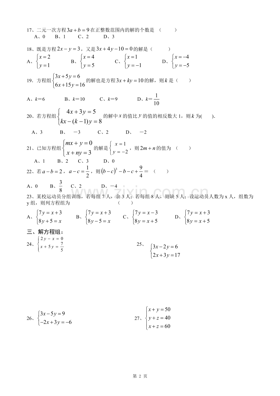 A、二元一次方程只有一个解 B、二元一次方程组有无数个解