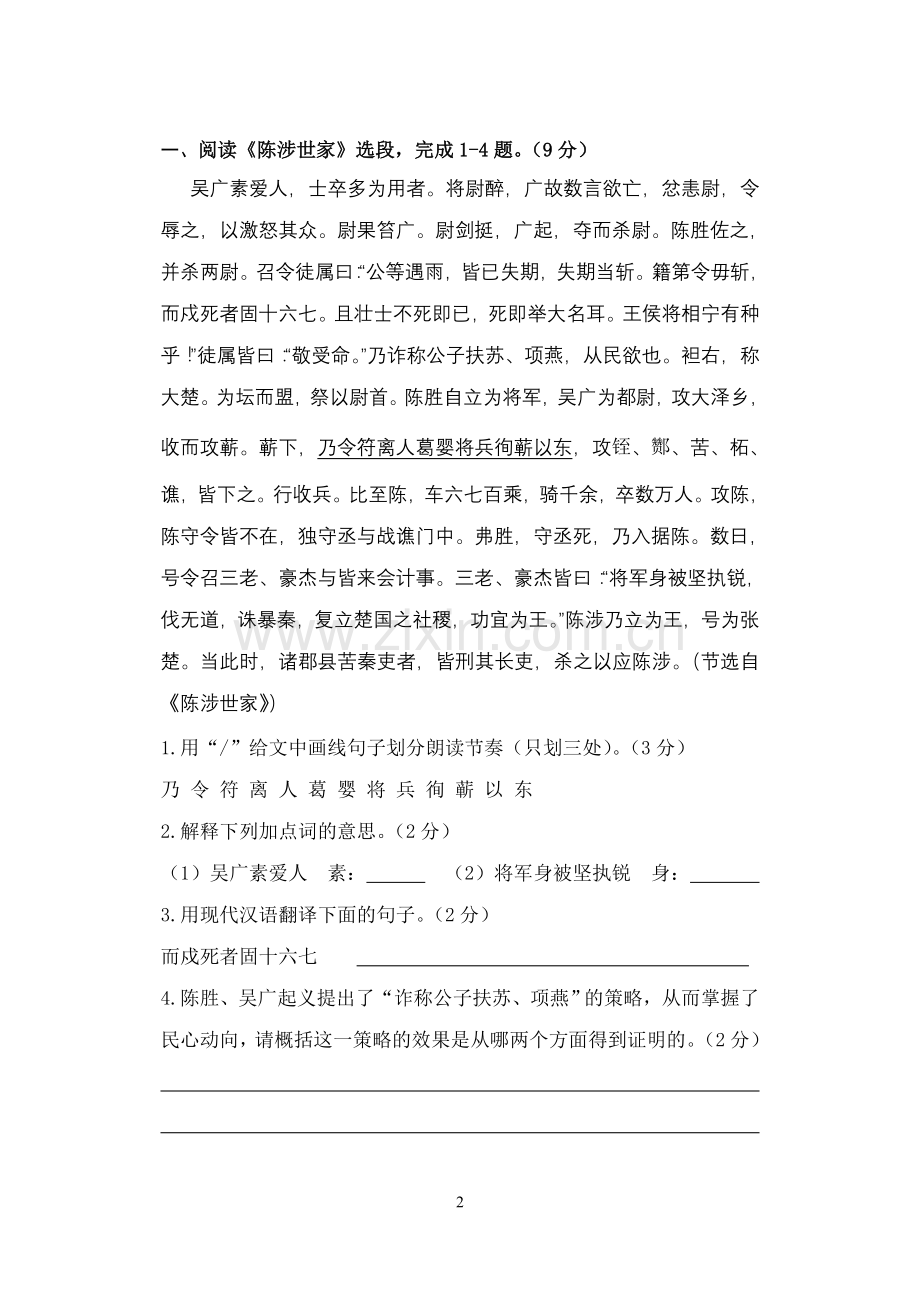 3.(2分)可是戍守边塞的人本来十个中也得死去六七个。(译出大意1分,关键词“固”“十六七”1分)4.(2分)起义队伍迅速发展并建立张楚政权;各郡县纷纷举事响应陈涉。(答出一点给1分)