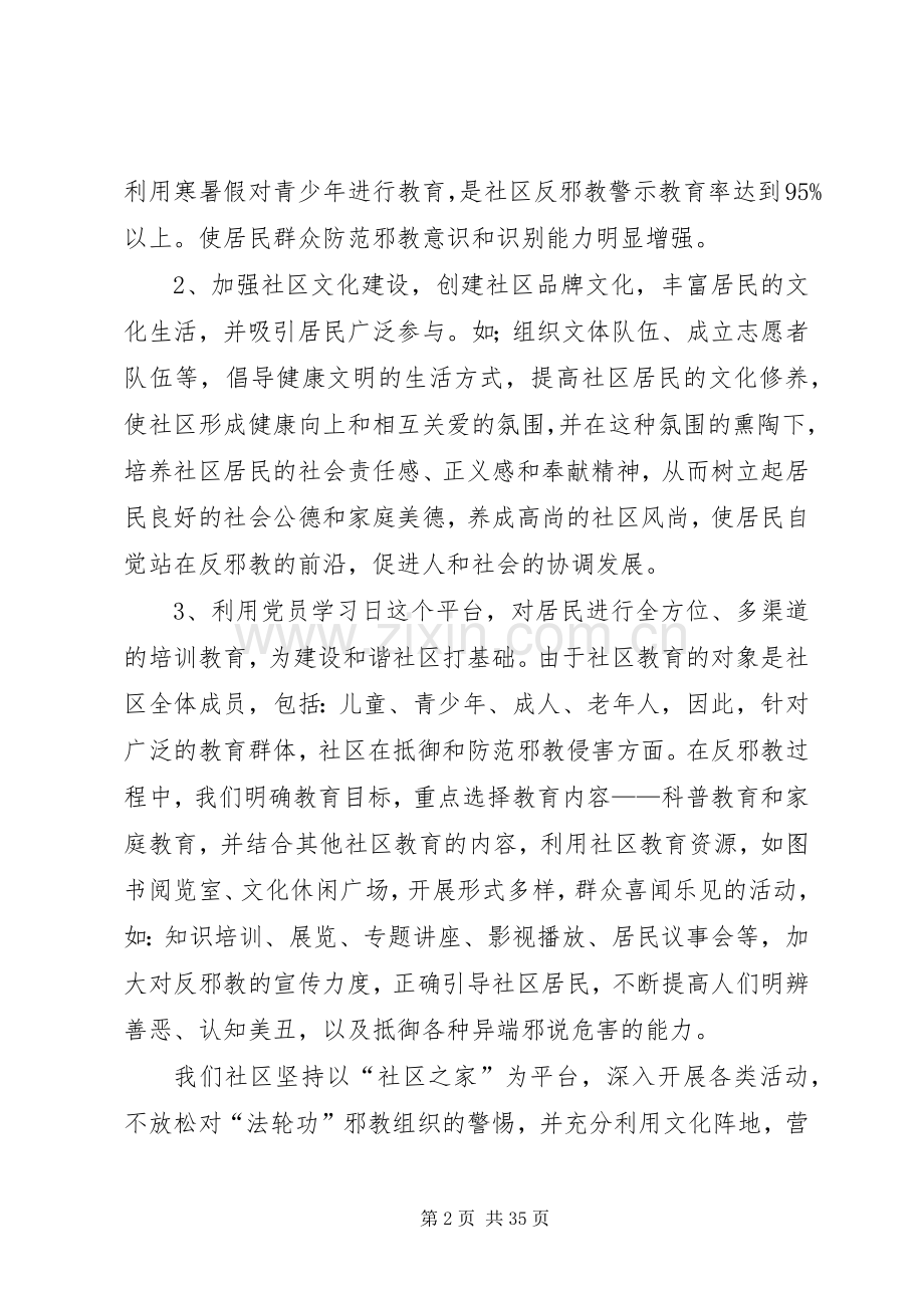 1、在居民小区以悬挂横幅、张贴宣传标语、出黑板报的形式进行广泛宣传,用展板宣传的形式到辖区单位、学校进行宣传,努力营造“崇尚科学,关爱家庭,珍惜生命,反对邪教”的良好氛围。增强广大群众防邪拒邪反邪的意识。社区还将反邪教警示教育纳入党员教育的内容,利用居民代表会进行反邪教警示教育,利用寒暑假对青少年进行教育,是社区反邪教警示教育率达到95%以上。使居民群众防范邪教意识和识别能力明显增强。