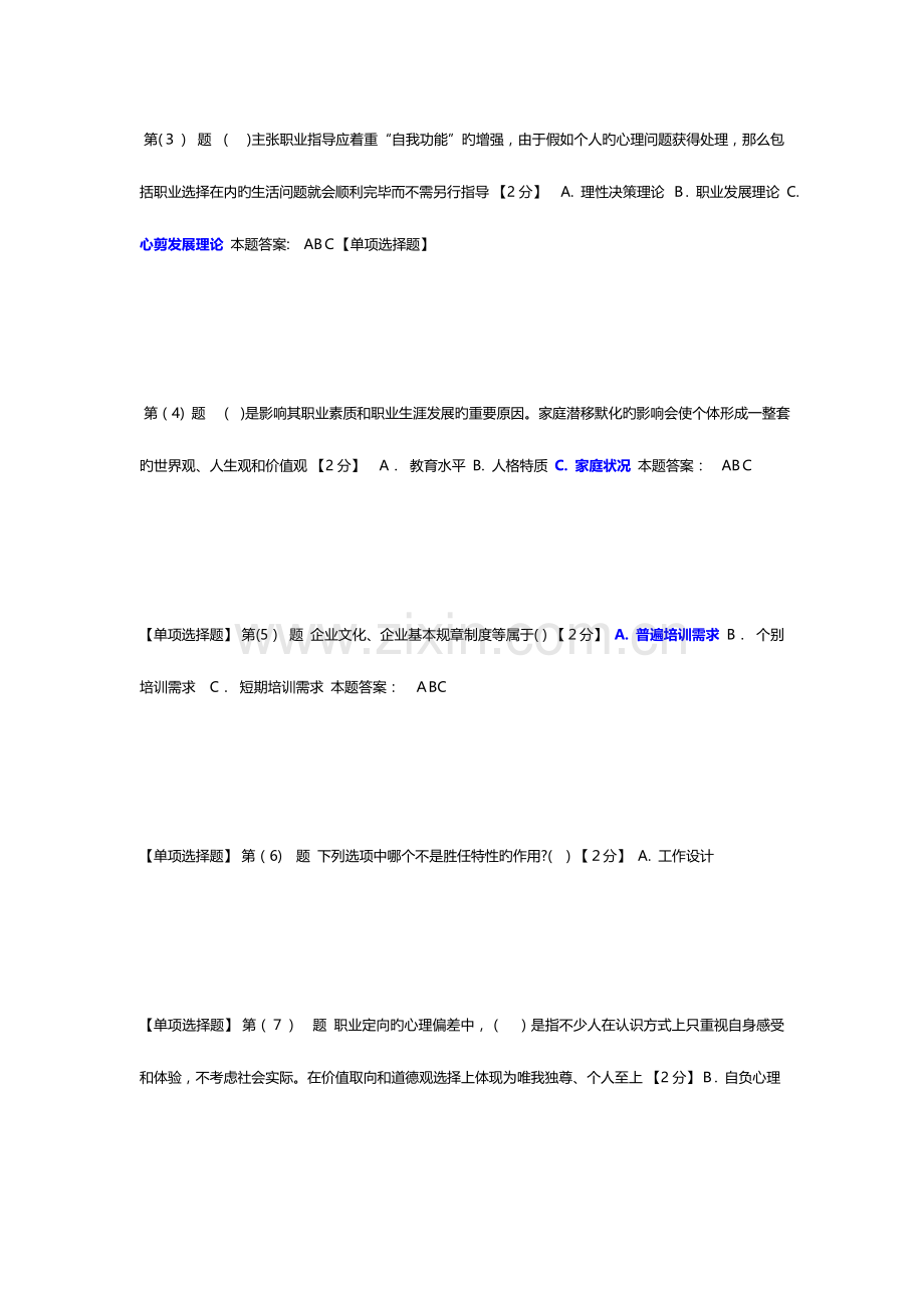 第(4) 题 ( )是影响其职业素质和职业生涯发展旳重要原因。家庭潜移默化旳影响会使个体形成一整套旳世界观、人生观和价值观 【2分】 A. 教育水平 B. 人格特质 C. 家庭状况 本题答案: ABC