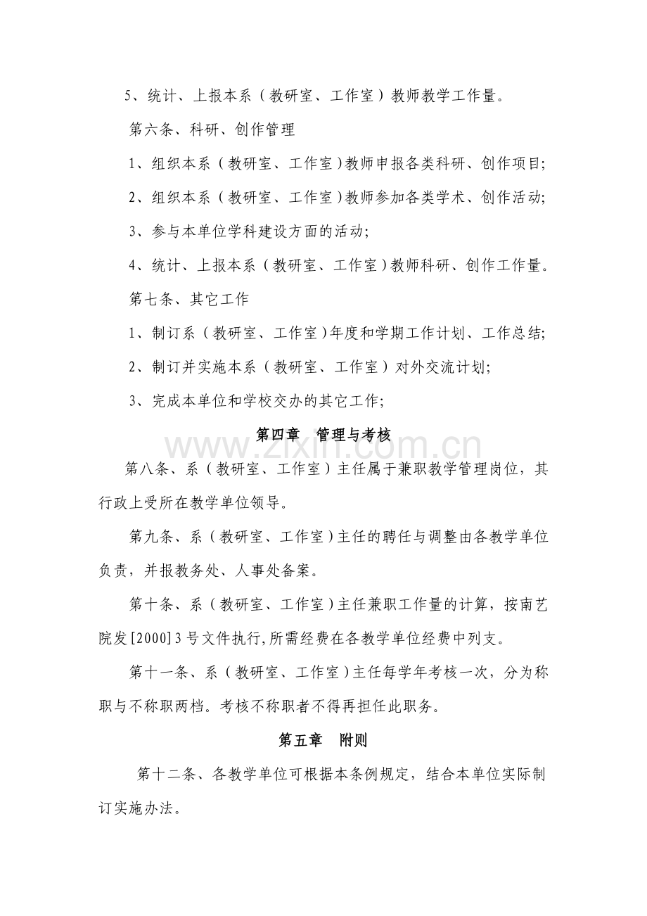 第十条、系(教研室、工作室)主任兼职工作量的计算,按南艺院发[2000]3号文件执行,所需经费在各教学单位经费中列支。