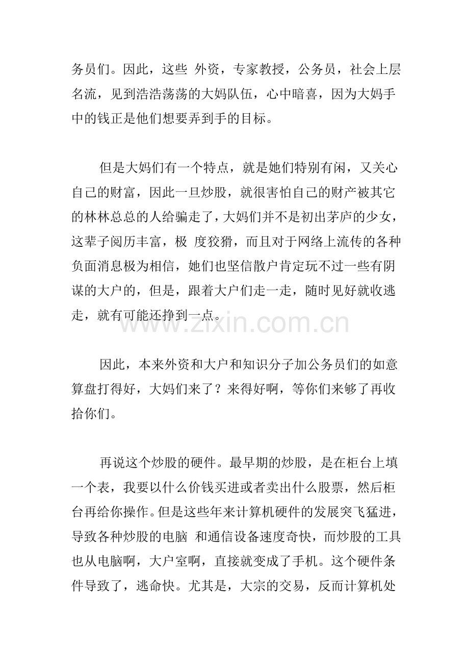 再说机构,通常炒股的人是炒的别人的股,老板的股,什么时候要逃命,需要老板做决定,自己轻易不敢做主,因此一旦有风吹草动,立即上报老板,这可能就晚了几秒钟,就完蛋了。而一 些专家教授们,高层知识分子们,还有公务员们,他们主要的特点是,没有大妈那么闲,有自己的公务在身,不可能每一秒都盯着股市,有可能做一个骗人的演讲走出会场,就发现自己几百 万元钱没了。
