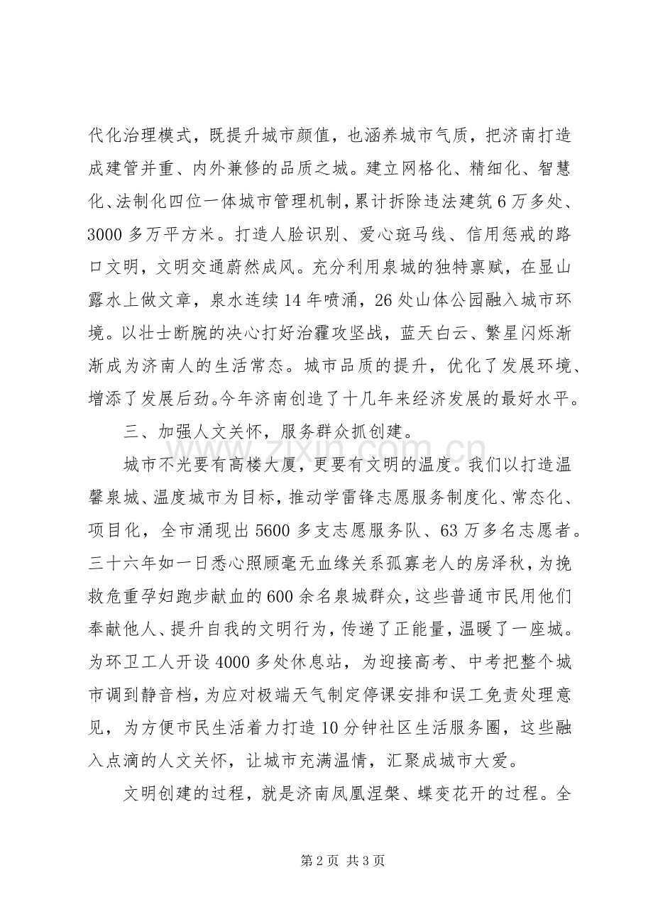 文明创建的过程,就是济南凤凰涅槃、蝶变花开的过程。全国文明城市的荣誉,是对济南过去20年文明进步的肯定,更是对未来再攀高峰的期许。我们一定用习近平新时代中国特色社会主义思想武装头脑、指导实践、推动工作,认真贯彻表彰大会精神,以城市发展的新气象和城市文明的新进步,为决胜全面建成小康社会做出新的更大贡献。