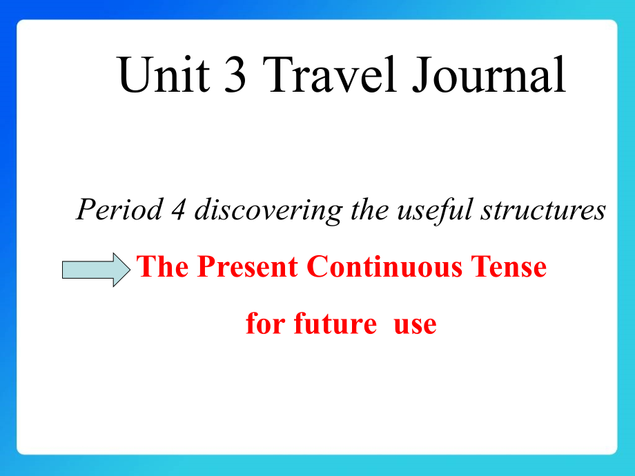 单击此处编辑母版标题样式,单击此处编辑母版文本样式,第二级,第三级,第四级,第五级,*,Unit 3 Travel Journal,Period 4,discovering the useful structures,The Present Continuous Tense for future use,What is she doing?,She,is,listen,ing,to music.,They,are,sing,ing,!,What are they doing?,A:What is Mr.Green doing recently?,B:He,is,writ,ing,a new novel.,他在写另一部小说。(说话时并未在写,只处于写作的状态。),(1)表示现在的动作:,表示说话时(此时此刻)正在进行的动作,与时间状语,now,at the moment,right now,等连用。,e.g.,The students are doing homework now.,表示现阶段正在进行的动作,而不一定是说话时正在进行的动作,常与,today,this week,this term,recently,等连用。,e.g.He is writing a new novel recently.,review,现在进行时,(2)表示反复性或习惯性的动作:,常与副词,always,continually,(,频繁地),等连用,有强烈的感情色彩,表示说话人的(褒)赞扬,(贬)厌恶,不满,遗憾等的感情色彩。,e.g.Shes always changing her mind.,The Present Continuous Tense,can be used to express a plan or an arrangement,.,现在进行时表示将来,When,are,you,leaving,?,=When,you,leave?,=When,you leave?,Where are you staying?,How are you going to?,How long are you staying in?,When are you arriving in/at?,When are you coming back?,Sentence pattern:,look back,Warming Up,2,(P17),表将来,are,going to,will,Journey down the Mekong,Task one pair work,Here is another dialogue on page 21.In the dialogue a newspaper reporter is interviewing Wang Wei about her plans for the trip along the Mekong River.However,they are not sure about some of the verb tenses.Can you help them,complete,their conversation?,Sr:Miss Wang,I hear that you,along the Mekong River.,Thats really exciting.Have you got everything ready?,Sw:Almost.,Sr:When,you,?,Sw:Next Monday.,Sr:How far,you,each day?,Sw Its hard to say.If the weather is fine,I think well be able to ride 75 km a day.,Sr:What about the weather in Qinghai Province?,Sw:The weather forecast is not good so we,a large parcel of warm clothes with us.,Sr:Where,you,at night?,Sw:Usually in our tent,but sometimes in the villages along the river bank.,Sr:What happens if you have an accident?,Sw:Dont worry.I had some medical training at my college.,Besides,we,out insurance to cover any problems.,Sr:Well,it sounds fun.I hope youll have a pleasant journey.Thank you for your time.,are going to travel,are,leaving,are,cycling,will/are going to,take,are,staying,will take/are taking,用现在进行时表示将来:,(1)指的是,近期的,按计划或安排要发生,的动作;常有“意图”“安排”或“打算”的含义;感觉比较生动,给人一种期待感。,(2)谓语通常为,瞬间性,的动词(并非所有动词)。,如,come,go,arrive,leave,start,begin,return,meet,stay,play,do,have,take,get to,see off,travel,fly,drive,walk,reach,meet,Im leaving tomorrow.,He is coming back this Sunday.,How are you getting there?,我星期五动身去北京。,Im leaving for Beijing this Friday.,2.我的朋友今晚过来。,My friends are coming over this evening.,3.下周五我们乘飞机去上海。,We are flying to Shanghai next Friday.,4.下课后我们打算在操场踢足球。,After class we are playing football on the playground.,leave/go,come,fly,play,练一练,翻译下列句子。,will/shall+动词原形,,,表示将来某个时间要发生的动作或存在的状态;或表示自然趋势或非主观意志。,e.g.,He will write you a letter next week.,I shall be sixteen years old next month.,be,going to,+动词原形,表示“就要”,“打算”或将要发生的事。,e.g.,Were not going to have any classes next week.,表示将来的时态还有下列方法:,be to动词原形,:表示按计划要发生的事或征求对方意见。,e.g.,Are we to go on with this work?,be about to,动词原形:表示即将发生的动作,不与表示将来的时间状语连用,。,e.g.,I was about to go swimming when,my guide shouted at me and told me not to do so,.,一般现在时表示将来时,(1),come,go,leave,move,start,return,arrive,begin,stay,等动词表示的是航班,轮船等时间表时,用一般现在时表将来。,e.g.The plane takes off at 10:10.That is,its,leaving,in ten minutes.,(2)用在状语从句中用一般现在时代替将来时。,If you do that again,Ill hit you.,二、动词填空,I,_,(leave)in a minute.I _(finish)all my work before I _(leave).,2.How long _ you _(study)in our country?,I _(plan)to be here for about one more year.,I _(hope)to visit the other parts of your country.,What _ you _(do)after you _(leave)here?,I _(return)home and _(get)a job.,3.I _(write)the composition tonight.,4.Marys birthday is next Monday,her mother _,(give)her a present.,巩固练习,am leaving,will finish,leave,will,study,plan,hope,will,do,leave,will return,get,am writing,is going to give,Summary,Present Continuous Tense for future use.,be doing,Verbs:,come,go,arrive,leave,start,begin,return,meet,stay,play,do,have,take,get to,see off,etc.,Revision of the Present Continuous Tense,and the Simple Future Tense.,1.Do Ex 1 and 2 in the Using structures on page 57-page 58.You are asked to write your plan for a trip by discussing with your partners,.,2.Review The Present Continuous,Tense for future use.,Homework,Thank you!,