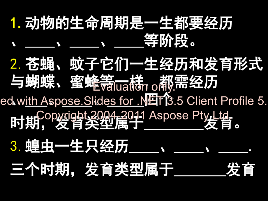 单击此处编辑母版标题样式,单击此处编辑母版文本样式,第二级,第三级,第四级,第五级,*,1.,动物的生命周期是一生都要经历,、,、,、,等阶段。,2.,苍蝇、蚊子它们一生经历和发育形式与蝴蝶、蜜蜂等一样,都需经历,、,、,、,四个,时期,发育类型属于,发育,。,3.,蝗虫一生只经历,、,、,.,三个时期,发育类型属于,发育,Evaluation only.,Created with Aspose.Slides for.NET 3.5 Client Profile 5.2.0.0.,Copyright 2004-2011 Aspose Pty Ltd.,4.,如图是受精及受精卵植入子宫的过程,请根据图回答问题。,(1)卵细胞是由,_,产生的,(2),是孕育新生命的场所。最初的胚胎必须植入,上才能继续发育,(,3)受精卵是卵细胞与精子,结合的产物,结合的过程叫,,该过程在_里进行。,胚胎与母亲靠,_,_,相联系。,胚胎在母体内的发育需要,_,个月左右,胎儿的产出包括,_,_,_.,Evaluation only.,Created with Aspose.Slides for.NET 3.5 Client Profile 5.2.0.0.,Copyright 2004-2011 Aspose Pty Ltd.,5.,个体的生长发育从,_,开始。,6.,植入子宫前的早期胚胎发育所需要的营养物质是由,_,提供的。植入子宫后的营养主要是由,_,提供的。,7.,受精的真正含义是指(),A、精子与卵子接触,B、整个精子进入卵细胞内,C、精子细胞核与卵细胞核融合,D、许多精子进入卵细胞中,Evaluation only.,Created with Aspose.Slides for.NET 3.5 Client Profile 5.2.0.0.,Copyright 2004-2011 Aspose Pty Ltd.,8.,(,1,),精子和卵细胞是人体中的,细,胞(,2,)精子和卵细胞的比较。,精子,卵细胞,大小,长约,0.05,毫米,直径为,毫米,是人体内,的细胞,形态,形,形,其他,有尾巴,能游动,不能游动,Evaluation only.,Created with Aspose.Slides for.NET 3.5 Client Profile 5.2.0.0.,Copyright 2004-2011 Aspose Pty Ltd.,9.,男性的生殖系统主要由,、,、,、,等器官组成。其中,是男性的主要生殖器官,能产生,。还能分泌,。,女性的生殖系统主要由,、,、,、,等器官组成。其中,是女性的主要生殖器官,能产生,。还能分泌,。,10.,青蛙的生殖行为(抱对),这种生殖方式属,,与鱼类相比,这种生殖行为使精子和卵细胞的结合机会大大,(填“增加”或“降低”),是生物进化在行为上的表现。,Evaluation only.,Created with Aspose.Slides for.NET 3.5 Client Profile 5.2.0.0.,Copyright 2004-2011 Aspose Pty Ltd.,11.,黏虫是一种危害多种作物的害虫,,下面是黏虫发育的四个时期的形态图,,据图回答下列问题:,黏虫的个体发育顺序是,(,填代码),它的发育属于,发育。,与黏虫相比,蝗虫的个体发育不经过的,时期是_(填代码)蝗中属于,发育。,Evaluation only.,Created with Aspose.Slides for.NET 3.5 Client Profile 5.2.0.0.,Copyright 2004-2011 Aspose Pty Ltd.,12.,动物的生殖一般可分为,_生殖,和,_生殖,两大类通过精子和卵细胞结合形成受精卵,产生新个体的生殖方式叫,_生殖,。进行有性生殖的动物根据其精子、卵细胞结合的场所不同,即受精方式分为,_和_,两大类。,在有性生殖中根据,胚胎发育的方式不同可分为,_,_、_、_。,属于卵胎生的代表动物是,_,_、_。,Evaluation only.,Created with Aspose.Slides for.NET 3.5 Client Profile 5.2.0.0.,Copyright 2004-2011 Aspose Pty Ltd.,D,A,B,14.,由一个母体分裂成两个大小和形状大体相同的子体的生殖方式叫,,如,、,等,水螅,酵母茵属于_生殖,C,13,.,根据昆虫发育模式图,请回答:,各个不同发育阶段的名称:,A_ B,C_ D_,Evaluation only.,Created with Aspose.Slides for.NET 3.5 Client Profile 5.2.0.0.,Copyright 2004-2011 Aspose Pty Ltd.,15.,下图一是公鸡外形,二是母鸡外形,三是摘除了睾丸的公鸡,四是摘除了卵巢的母鸡,从一二可见、公鸡和母鸡的外形有明显的差异。如公鸡与母鸡相比较,公鸡的鸡冠较高,羽毛颜色鲜艳,尾羽较长,这些特征是公鸡的_性征。,Evaluation only.,Created with Aspose.Slides for.NET 3.5 Client Profile 5.2.0.0.,Copyright 2004-2011 Aspose Pty Ltd.,图三是公鸡的躯体,但公鸡的_消失了,原因是摘除了_,缺少了_,,因此使_不能维持。,(3)图四是母鸡的躯体,但母鸡的_消失了,原因是摘除了_,缺少了_,因此使_不能维持。,Evaluation only.,Created with Aspose.Slides for.NET 3.5 Client Profile 5.2.0.0.,Copyright 2004-2011 Aspose Pty Ltd.,16.,小明想知道温度对小鸡孵出率的影响,他选取了,50,个鸡蛋,分别各取,10,个放在,5种,不同的温度下对其进行孵化,得到下列的结果:,温度,30,35,40,45,50,孵化出小鸡数,0,3,7,5,0,(1)你认为小明的实验有没有可以补充的地方?什么地方?,Evaluation only.,Created with Aspose.Slides for.NET 3.5 Client Profile 5.2.0.0.,Copyright 2004-2011 Aspose Pty Ltd.,2)从上面的数据中你认为:孵化小鸡与外界的温度有没有关系?,,我们孵化小鸡的温度最好选择在,。,温度,30,35,40,45,50,孵化出小鸡数,0,3,7,5,0,Evaluation only.,Created with Aspose.Slides for.NET 3.5 Client Profile 5.2.0.0.,Copyright 2004-2011 Aspose Pty Ltd.,17.,为了知道人类的生殖是否与季节有关,小明在班中(共,40,人)调查了一下同学的生日,并绘制了折线图,从图中可得结论是:,_,为了使结论更加具有说服力,应怎样做?,_,Evaluation only.,Created with Aspose.Slides for.NET 3.5 Client Profile 5.2.0.0.,Copyright 2004-2011 Aspose Pty Ltd.,18.,读图回答:,(1)蚕豆幼苗的根,由图中的,发育,而来;茎和叶由图,中的,发育而来;,胚由,组成。,(填字母),(2)蚕豆种子中为种子萌发提供营养的是,。(填字母),Evaluation only.,Created with Aspose.Slides for.NET 3.5 Client Profile 5.2.0.0.,Copyright 2004-2011 Aspose Pty Ltd.,(3)在玉米种子的剖面上滴碘液,被染成蓝色的是图中,_,,证明玉米种子成分中含有,_,,玉米种子的胚是由,_,_,_,_,组成。,(填字母和名称),Evaluation only.,Created with Aspose.Slides fo