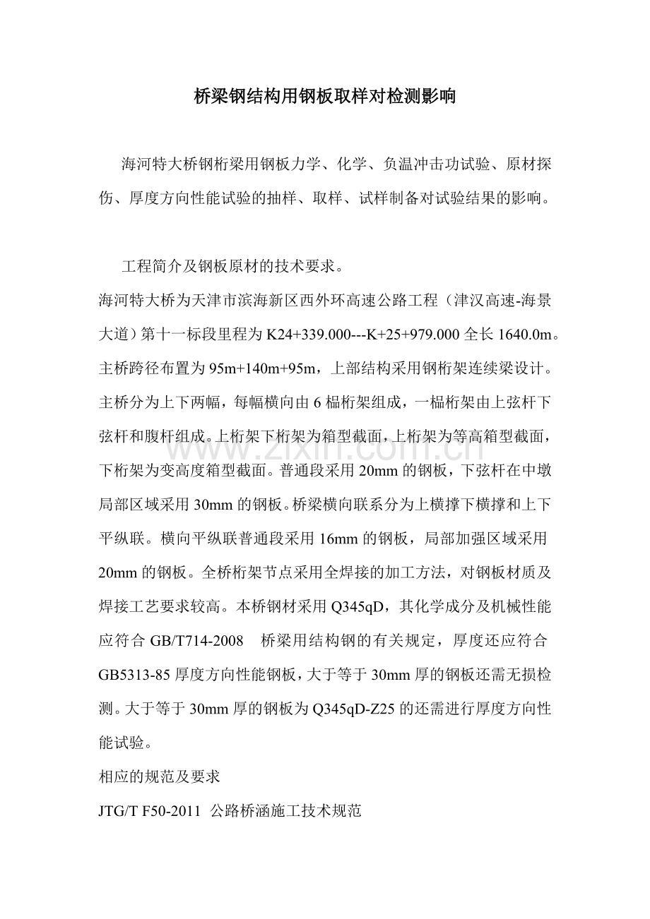 海河特大桥钢桁梁用钢板力学、化学、负温冲击功试验、原材探伤、厚度方向性能试验的抽样、取样、试样制备对试验结果的影响。