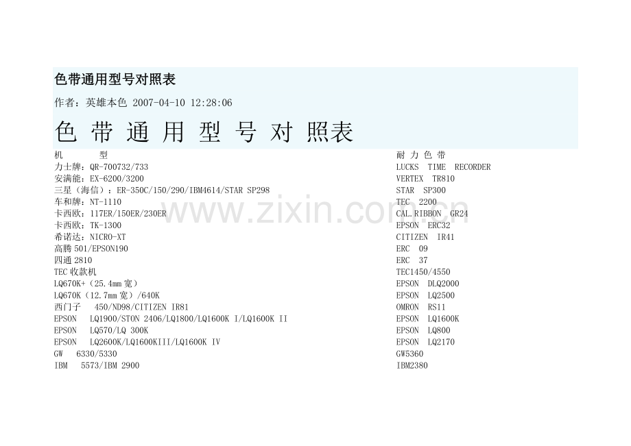 国内常用色带芯通用型号一览表 (仅供经销商参考)