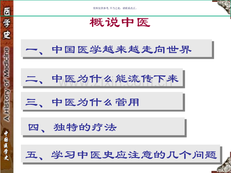 中中中中国国国国医医医医学学学学史史史史资料仅供参考,不当之处,请联系改正。中国医学史目录中国医学史目录LIST OF CHINESE MEDICINE HISTORY第五章第五章临床床经验的的总结与理与理论升升华宋元(宋元(9601368)第六章第六章中医中医药的鼎盛与的鼎盛与创新新明清明清.鸦片片战争前(争前(13681840)第七章第七章中西医学的交中西医学的交汇与冲突与冲突鸦片片战争中争中华人民共和国成立(人民共和国成立(18401949)第八章第八章中医中医药学的新生学的新生中中华人民共和国成立后(人民共和国成立后(1940年后)年后)中中中中国国国国医医医医学学学学史史史史资料仅供参考,不当之处,请联系改正。概说中医 一、中国医学越来越走向世界 二、中医为什么能流传下来 三、中医为什么管用 四、独特的疗法 五、学习中医史应注意的几个问题中中中中国国国国医医医医学学学学史史史史资料仅供参考,不当之处,请联系改正。中医为什么能流传下来 我国有不间断的文字记载的历史 中中中中国国国国医医医医学学学学史史史史资料仅供参考,不当之处,请联系改正。中医为什么管用 中医的特点是:整体观念 辨证论治中中中中国国国国医医医医学学学学史史史史资料仅供参考,不当之处,请联系改正。中医独特的治疗方法针灸 中中中中国国国国医医医医学学学学史史史史资料仅供参考,不当之处,请联系改正。学习中医史应该注意的几个问题 1.“中医学”指中国传统医学(主要为汉医)2.中医具有完整的哲学框架和缜密 的理论体系 3.中医学是一种古代经验医学,几千年发展使其完善程度大大超过其他古代医学 4.关于中医现代化问题 中中中中国国国国医医医医学学学学史史史史资料仅供参考,不当之处,请联系改正。概概 念念 中国医学史:中国医学史:是关于中国医药学的起是关于中国医药学的起源、形成、发展过程和发展规律的一门学源、形成、发展过程和发展规律的一门学科。科。一、什么是医学史一、什么是医学史中中中中国国国国医医医医学学学学史史史史资料仅供参考,不当之处,请联系改正。中中中中国国国国医医医医学学学学史史史史资料仅供参考,不当之处,请联系改正。中中中中国国国国医医医医学学学学史史史史资料仅供参考,不当之处,请联系改正。中中中中国国国国医医医医学学学学史史史史资料仅供参考,不当之处,请联系改正。绪绪绪绪 论论论论 二、中医学的发展历程二、中医学的发展历程中中中中国国国国医医医医学学学学史史史史资料仅供参考,不当之处,请联系改正。中国医学发展的历史脉络中国医学发展的历史脉络 原始原始 社会社会 中医中医药 的起源的起源 早在早在远古古时代,代,我我们的祖先的祖先为了生了生存和繁衍,在存和繁衍,在猎取取食物的食物的过程中,在程中,在同自然灾害、猛同自然灾害、猛兽、疾病作斗争的疾病作斗争的过程程中,已中,已经开始了医开始了医疗和保健活和保健活动。、中中中中国国国国医医医医学学学学史史史史资料仅供参考,不当之处,请联系改正。夏夏 商商 西西 周周 殷商殷商时期,期,农业、手工、手工业的的生生产有了有了显著著的的发展,青展,青铜器的广泛器的广泛应用,用,促使促使发明了明了银针、金、金针等医等医疗工具。工具。中中中中国国国国医医医医学学学学史史史史资料仅供参考,不当之处,请联系改正。春春 秋秋 战战 国国中医中医趋于于专业化化百家争百家争鸣医巫分离医巫分离“毉毉”中中中中国国国国医医医医学学学学史史史史资料仅供参考,不当之处,请联系改正。秦秦 汉汉 时时 期期中国医学中国医学史上的第史上的第一次高峰一次高峰中中中中国国国国医医医医学学学学史史史史资料仅供参考,不当之处,请联系改正。三三 国国 两两 晋晋 南北朝南北朝战争争频繁繁为医学的全面医学的全面发展展积累了累了经验中中中中国国国国医医医医学学学学史史史史资料仅供参考,不当之处,请联系改正。隋隋 唐唐 时时 期期国力国力强盛盛,文化繁荣文化繁荣,是中国医学是中国医学发展史上的展史上的第二次高峰第二次高峰中中中中国国国国医医医医学学学学史史史史资料仅供参考,不当之处,请联系改正。北北 宋宋 南南 宋宋中医中医药学学发展展的重要的重要时期期,有力的促有力的促进了了中医中医药学的学的进步步中中中中国国国国医医医医学学学学史史史史资料仅供参考,不当之处,请联系改正。明明 代代传统中医中医药开始出开始出现现代化的代化的前奏前奏中中中中国国国国医医医医学学学学史史史史资料仅供参考,不当之处,请联系改正。清清 代代 中医中医药学学发展出展出现革新革新趋势中中中中国国国国医医医医学学学学史史史史资料仅供参考,不当之处,请联系改正。绪论绪论绪论绪论 .第一节第一节第一节第一节 中医学的发展过程概况中医学的发展过程概况中医学的发展过程概况中医学的发展过程概况一一一一.学术体系形成时期学术体系形成时期学术体系形成时期学术体系形成时期二二二二.实用经验发展时期实用经验发展时期实用经验发展时期实用经验发展时期三三三三.理论总结与探索时期理论总结与探索时期理论总结与探索时期理论总结与探索时期四四四四.传统继承与创新时期传统继承与创新