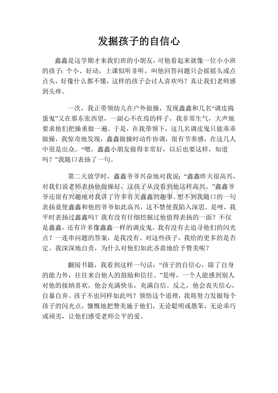 翻阅书籍,我看到这样一句话:“孩子的自信心,除了自身的能力外,往往来自他人的鼓励和信任。”是呀,一个人能感到别人对他的接纳喜欢,他会充满快乐,充满自信。反之,他会丧失信心,自暴自弃。孩子不也同样如此吗?领悟这个道理,我将努力发掘每个孩子的闪光点,慷慨地把赞美施于他们,无论聪明或愚笨,无论乖巧或顽劣,让他们感受老师公平的爱。