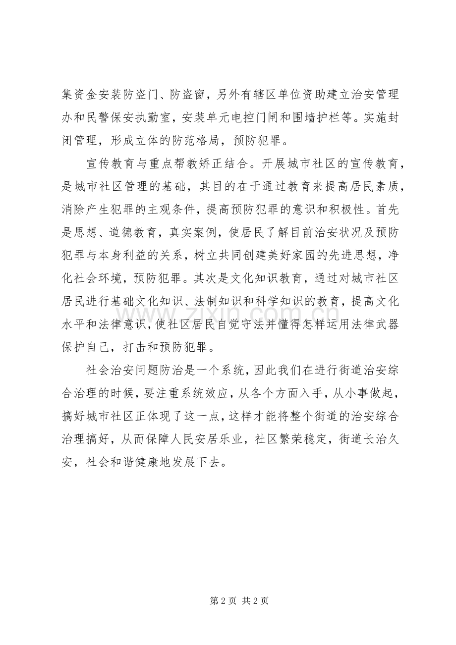 社会治安问题防治是一个系统,因此我们在进行街道治安综合治理的时候,要注重系统效应,从各个方面入手,从小事做起,搞好城市社区正体现了这一点,这样才能将整个街道的治安综合治理搞好,从而保障人民安居乐业,社区繁荣稳定,街道长治久安,社会和谐健康地发展下去。
