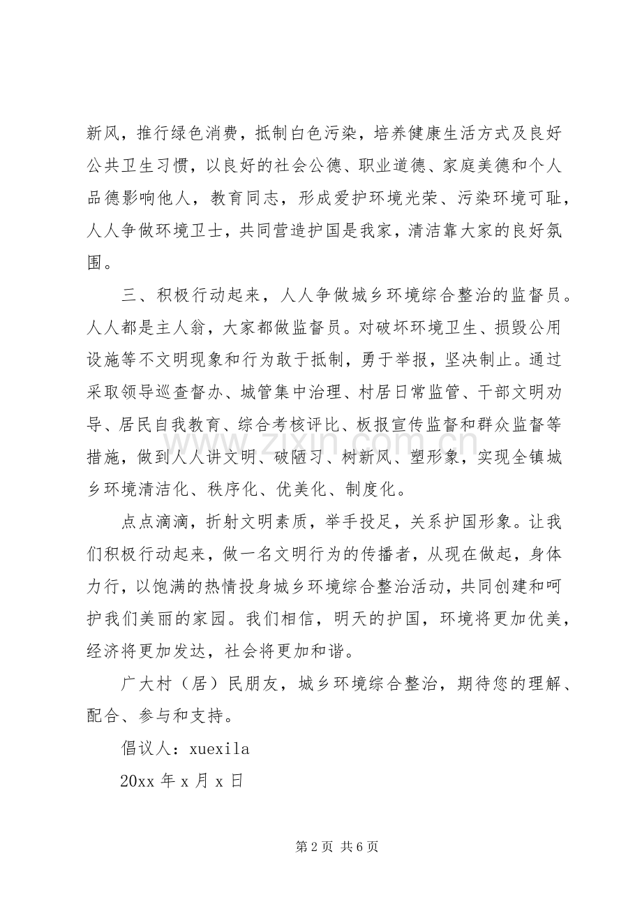 一、积极行动起来,人人争做城乡环境综合治理的示范员。踊跃投身城乡清洁卫生行动,自觉落实门前三包责任,坚决抵制五乱行为。即不乱丢乱倒垃圾、不乱摆乱设摊点、不乱停乱放车辆、不乱贴乱挂广告、不乱堆乱放建材;大力实施五改两建工程(改院坝、改房、改厨、改厕、改圈、建沼气、建生态庭院),开展厕所与厨房比干净、厨房与居室比整洁、庭院与居室比漂亮为主要内容的三比和卫生家庭评选活动,要自觉及时处理生活垃圾、清除杂草、畅通沟渠、隐蔽堆放杂物,家庭内部物品摆放井然有序,干净卫生,让我们以实际行动告别行为陋习、与文明同行、做文明护国镇人,共同营造天更蓝、水更清、地更洁、城村更美的生活环境。