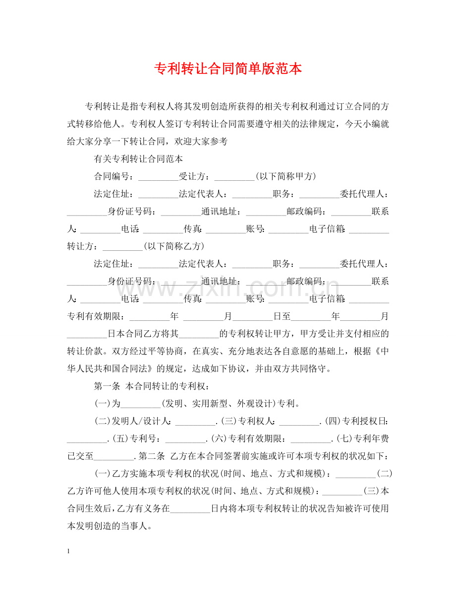 专利转让合同简单版范本