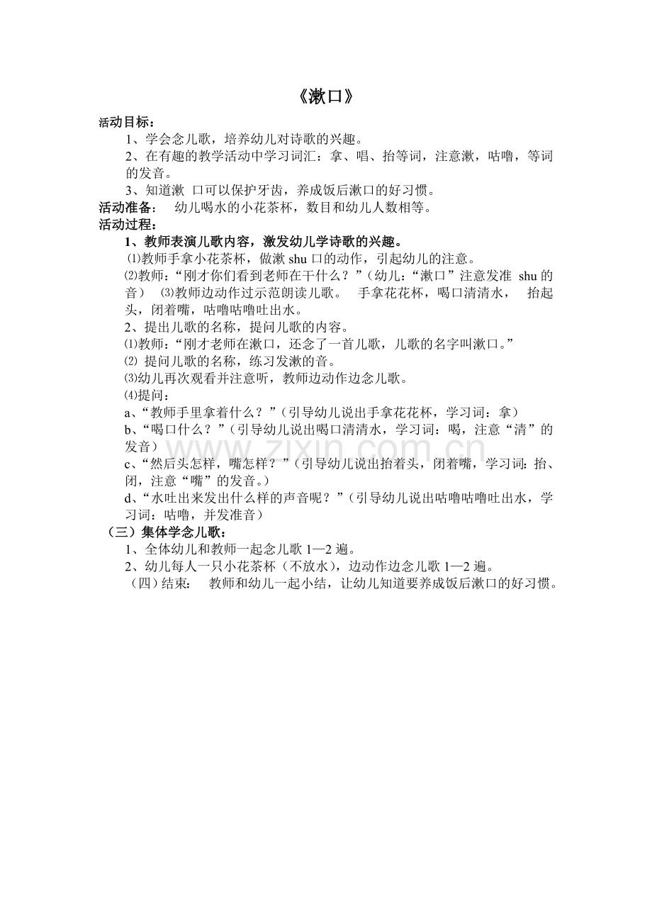 ⑴教师:“刚才老师在漱口,还念了一首儿歌,儿歌的名字叫漱口。”