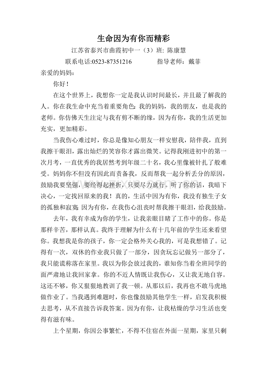 当我伤心难过时,你总是像知心朋友一样安慰我,陪伴我,直到我擦干眼泪,露出灿烂的笑容你才露出微笑。记得我刚进初中的第一次月考,一直优秀的我居然考到年级二十名,我心里像被针扎了般难受。妈妈你不但没有因此而责备我,反而帮我一起分析丢分的原因,鼓励我要坚强,要经得起挫折,只要尽力就行。听了你的话,我暗下决心,一定找回原来的我!真的,生活中因为有你,我没有独生子女的孤独和寂寞;因为有你,在我伤心沮丧时帮我擦干眼泪,给我鼓励。