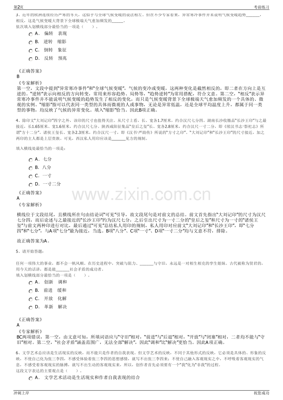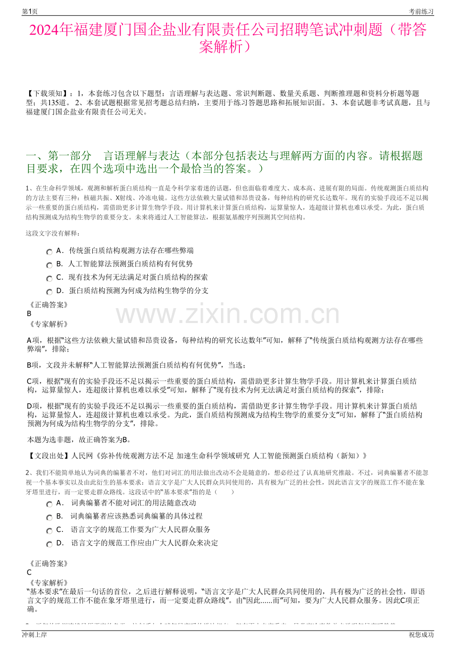 2024年福建厦门国企盐业有限责任公司招聘笔试冲刺题(带答案解析)【下载须知】:1,本套练习包含以下题型:言语理解与表达题、常识判断题、数量关系题、判断推理题和资料分析题等题型;共135道。2、本套试题根据常见招考题总结归纳,主要用于练习答题思路和拓展知识面。3、本套试题非考试真题,且与福建厦门国企盐业有限责任公司无关。一、第一部分言语理解与表达(本部分包括表达与理解两方面的内容。请根据题目要求,在四个选项中选出一个最恰当的答案。)1、在生命科学领域,观测和解析蛋白质结构一直是令科学家着迷的话题,但也面临着难度大、成本高、进展有限的局面。传统观测蛋白质结构的方法主要有三种:核磁共振、X射线、冷冻电镜。这些方法依赖大量试错和昂贵设备,每种结构的研究长达数年。现有的实验手段还不足以揭示一些重要的蛋白质结构,需借助更多计算生物学手段。用计算机来计算蛋白质结构,运算量惊人,连超级计算机也难以承受。为此,蛋白质结构预测成为结构生物学的重要分支。未来将通过人工智能算法,根据氨基酸序列预测其空间结构。这段文字没有解释:A传统蛋白质结构观测方法存在哪些弊端 B人工智能算法预测蛋白质结构有何优势 C现有技术为何无法满足对蛋白质结构的探索 D蛋白质结构预测为何成为结构生物学的分支正确答案B专家解析A项,根据“这些方法依赖大量试错和昂贵设备,每种结构的研究长达数年”可知,解释了“传统蛋白质结构观测方法存在哪些弊端”,排除;B项,文段并未解释“人工智能算法预测蛋白质结构有何优势”,当选;C项,根据“现有的实验手段还不足以揭示一些重要的蛋白质结构,需借助更多计算生物学手段。用计算机来计算蛋白质结构,运算量惊人,连超级计算机也难以承受”可知,解释了“现有技术为何无法满足对蛋白质结构的探索”,排除;D项,根据“现有的实验手段还不足以揭示一些重要的蛋白质结构,需借助更多计算生物学手段。用计算机来计算蛋白质结构,运算量惊人,连超级计算机也难以承受。为此,蛋白质结构预测成为结构生物学的重要分支”可知,解释了“蛋白质结构预测为何成为结构生物学的分支”,排除。本题为选非题,故正确答案为B。【文段出处】人民网弥补传统观测方法不足 加速生命科学领域研究 人工智能预测蛋白质结构(新知)2、我们不能简单地认为词典的编纂者不对,他们对词汇的用法做出改动不会是随意的,想必经过了认真地研究推敲。不过,词典编纂者不能忽视一个基本事实以及由此衍生的基本要求:语言文字是广大人民群众共同使用的,具有极为广泛的社会性,因此语言文字的规范工作不能在象牙塔里进行,而一定要走群众路线。这段话中的“基本要求”指的是()A 词典编纂者不能对词汇的用法随意改动 B 词典编纂者应该熟悉词典编纂的具体过程 C 语言文字的规范工作要为广大人民群众服务 D 语言文字的规范工作应由广大人民群众来决定正确答案C专家解析“基本要求”在最后一句话的首位,之后进行解释说明,“语言文字是广大人民群众共同使用的,具有极为广泛的社会性,即语言文字的规范工作不能在象牙塔里进行,而一定要走群众路线”。由“因此而”可知,要为广大人民群众服务。因此C项正确。3、近年的欧洲连续经历严寒的冬天,这似乎与全球气候变暖的说法相左。但在不少专家看来,异常寒冷事件并未说明气候变暖趋势_,第1页考前练习冲刺上岸祝您成功3、近年的欧洲连续经历严寒的冬天,这似乎与全球气候变暖的说法相左。但在不少专家看来,异常寒冷事件并未说明气候变暖趋势_,相反,这是气候变暖大背景下全球极端天气愈加频发的_。依次填入划横线部分最恰当的一项是()。A 偏转表现 B 逆转缩影 C 倒转象征 D 反转预兆正确答案B专家解析第一空,文段中提到“异常寒冷事件”和“全球气候变暖”,气候的变冷或变暖,这两种变化是截然相反的,即二者在方向上是互逆的。“逆转”表示向相反的方向转变,常用来形容趋势、局势等,“趋势逆转”为常用搭配,符合文意。第二空,“相反”表示异常寒冷事件并不能说明气候变暖的趋势发生了相反的变化,而只是气候变暖背景下全球极端天气愈加频发的一个具体的、微观的实例。“缩影”指可以代表同一类型的具体而微观的人或事物,无论是异常低温,还是全球平均温度上升,都属于同一类型的事物,均反映了气候的异常变化。填入“缩影”恰当。因此B项正确。4、除印文“大刘记印”四字之外,该印的尺寸也值得关注。从尺寸上看,长、宽各1.7厘米,约合汉尺七分四。湖南长沙收缴品“长沙王印”与之最接近,长1.65厘米、宽1.6厘米,约合汉尺七分。陕西咸阳征集品“皇后之玺”长、宽各2.8厘米,约合汉尺一寸二分,即续汉书志祭祀志所谓“方十二分”。诸侯王玺长、宽各2.3厘米,约合汉尺一寸,即汉书严助传所说的“方寸之印”。“大刘记印”和“长沙王印”的尺寸接近,加之两印的主人都是上层贵族。可见,西汉私人用印应该是 见方的规制。填入横线处最恰当的一项是:A七分 B八分 C一寸 D一寸二分正确答案A专家解析横线位于文段结尾,且横线所在句由结论词“可见”引导,故文段尾句是对前文的总结。前文首先指出“大刘记印”的尺寸为汉尺七分四,而后论述与之最接近的“长沙王印”约为汉尺