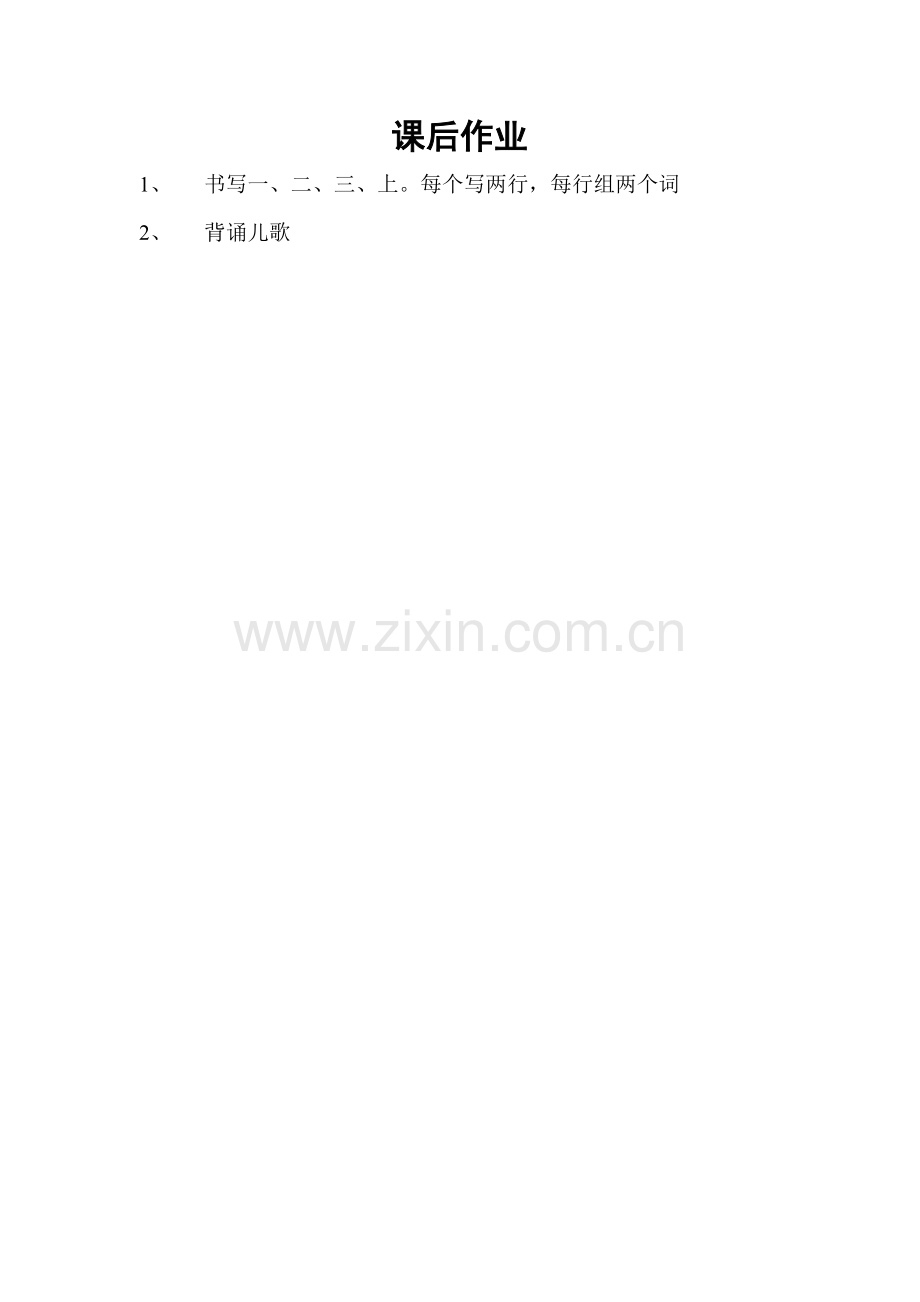 课后作业 1、 书写一、二、三、上。每个写两行,每行组两个词 2、 背诵儿歌