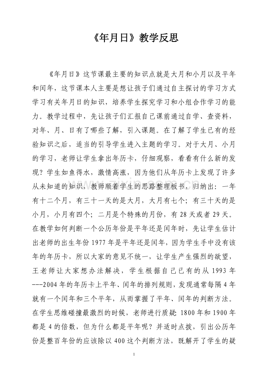 《年月日》这节课最主要的知识点就是大月和小月以及平年和闰年,这节课本人主要是想让孩子们通过自主探讨的学习方式学习有关年月日的知识,培养学生探究学习和小组合作学习的能力。教学过程中,先让孩子们汇报自己课前通过自学、查资料,对年、月、日有了哪些了解,引入课题。在了解了学生已有的经验知识之后,适当的引导学生进入主题的学习。对于大月、小月的学习,老师让学生拿出年历卡,仔细观察,看看有什么新的发现?学生如鱼得水,激情高涨,因为他们从年历卡上发现了许多从未知道的知识,教师顺着学生的思路整理板书,归纳出:一年有十二个月,有三十一天的是大月,大月有七个;有三十天的是小月,小月有四个;二月是个特殊的月份,有28天或者29天。在教学如何判断一个公历年份是平年还是闰年时,先让学生估计出老师的出生年份1977年是平年还是闰年,因为学生手中没有该年的年历卡,所以大家的意见不统一,让学生产生强烈的欲望,王老师让大家想办法解决,学生根据自己已有的从1993年---2004年的年历卡上平年、闰年的排列规则,发现通常每隔4年就有一个闰年和三个平年,从而掌握了平年、闰年的判断方法。在学生思维碰撞最激烈的时候,老师进行质疑:1800年和1900年都是4的倍数,但为什么都是平年呢?并适时点拨,引出公历年份是整百年份的应该除以400这个判断方法,既解开了学生的疑惑,又恰倒好处,学生自然接受。整节课大部分的内容都由孩子们自己通过观察与分析得出来,充分体现了学生的主体地位。