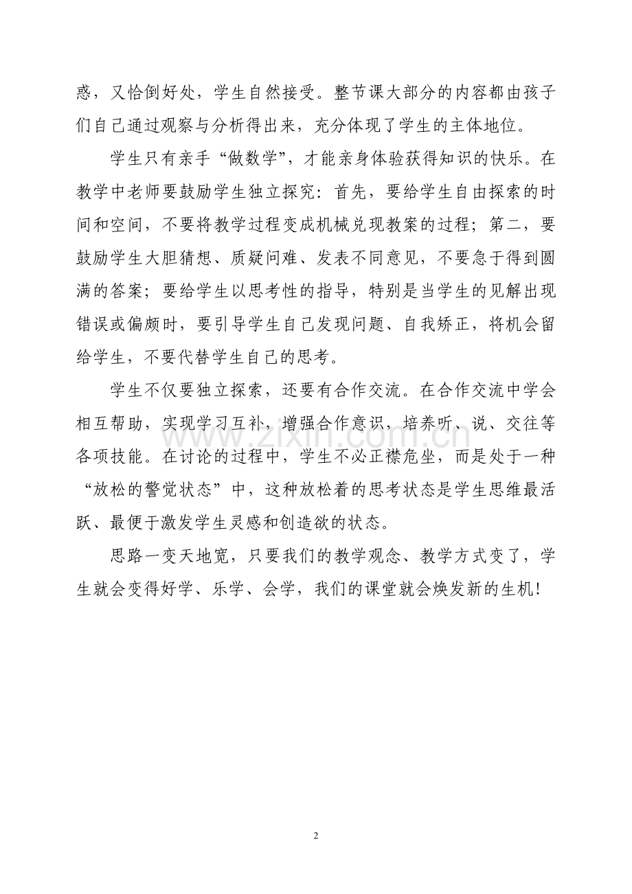 学生只有亲手“做数学”,才能亲身体验获得知识的快乐。在教学中老师要鼓励学生独立探究:首先,要给学生自由探索的时间和空间,不要将教学过程变成机械兑现教案的过程;第二,要鼓励学生大胆猜想、质疑问难、发表不同意见,不要急于得到圆满的答案;要给学生以思考性的指导,特别是当学生的见解出现错误或偏颇时,要引导学生自己发现问题、自我矫正,将机会留给学生,不要代替学生自己的思考。