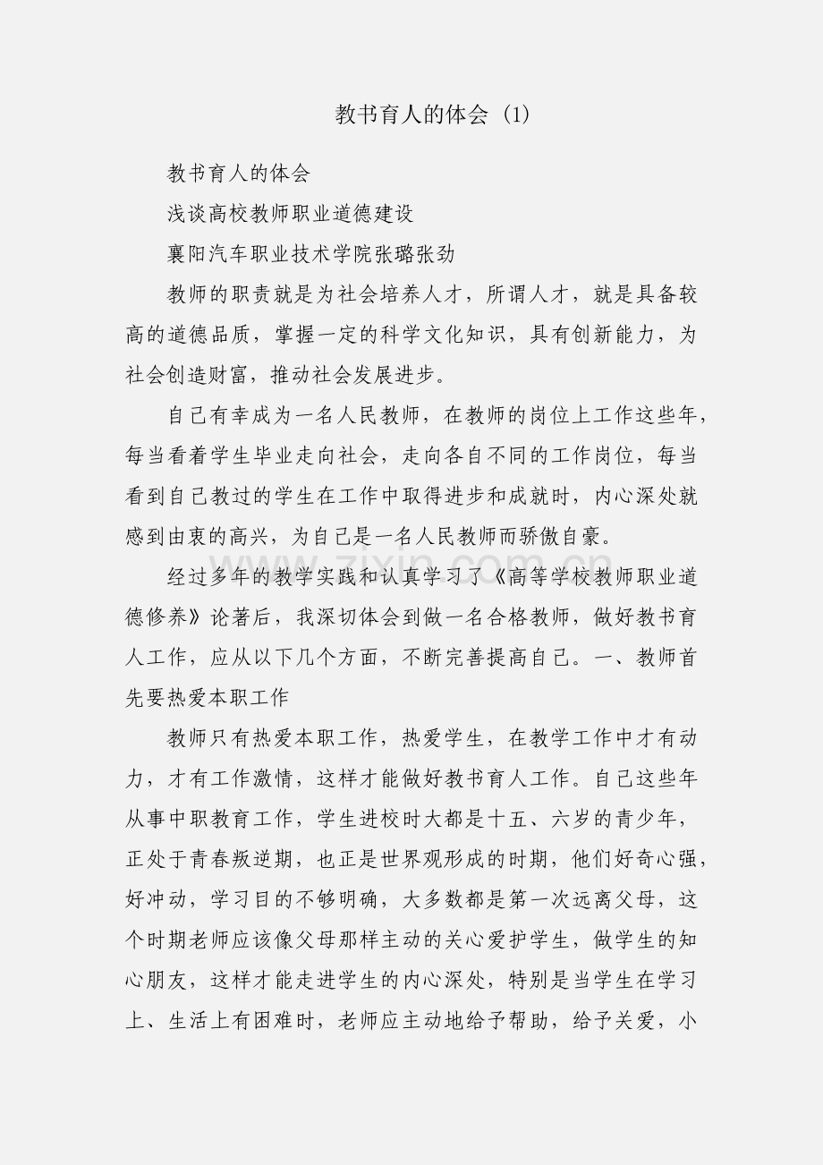 经过多年的教学实践和认真学习了《高等学校教师职业道德修养》论著后,我深切体会到做一名合格教师,做好教书育人工作,应从以下几个方面,不断完善提高自己。一、教师首先要热爱本职工作